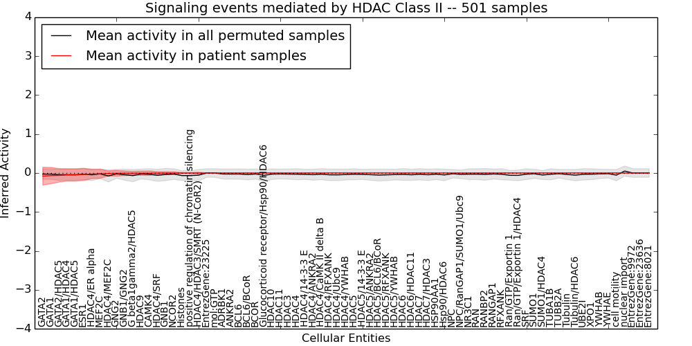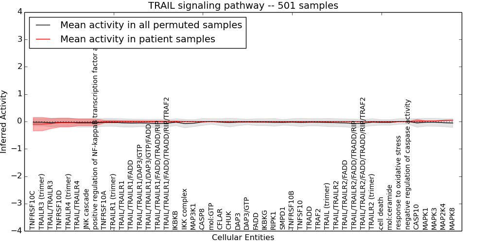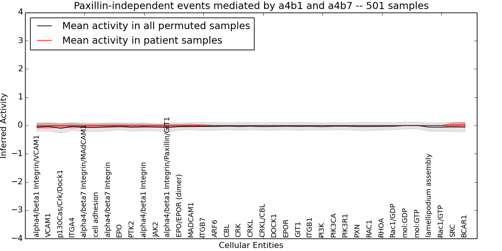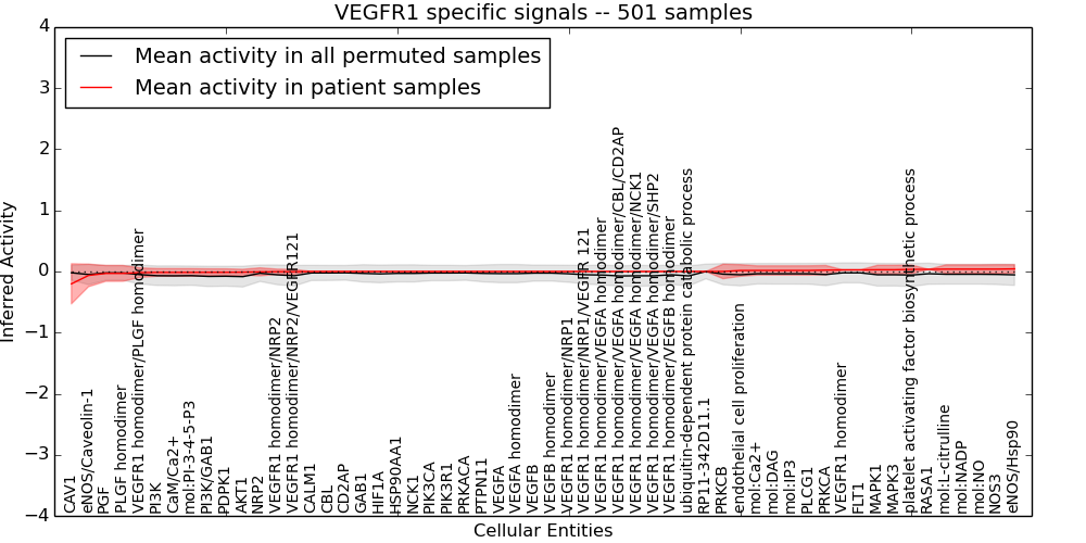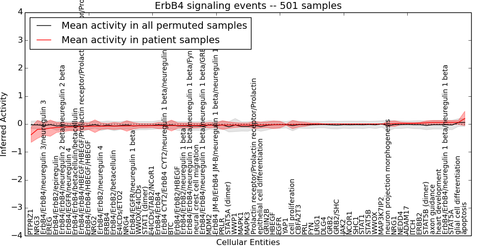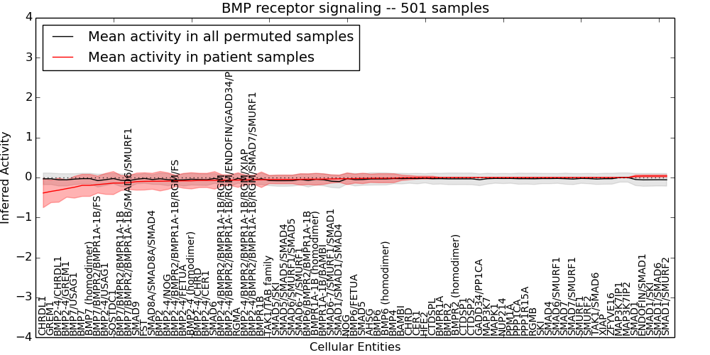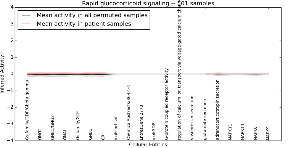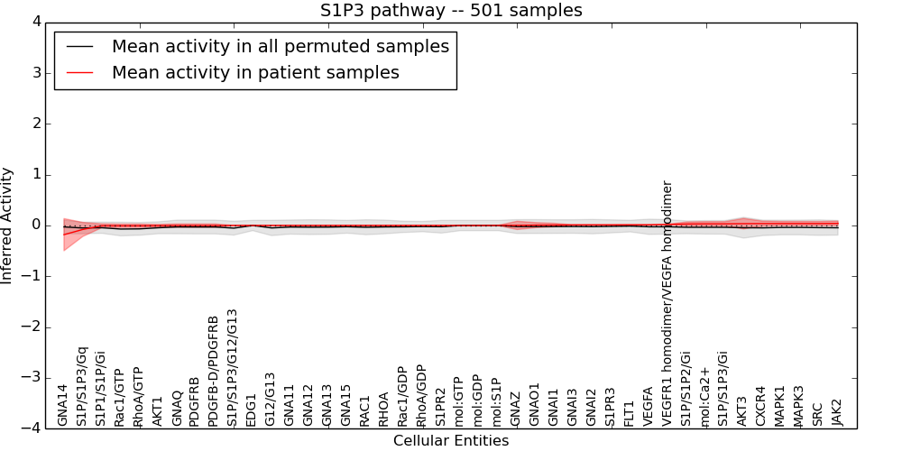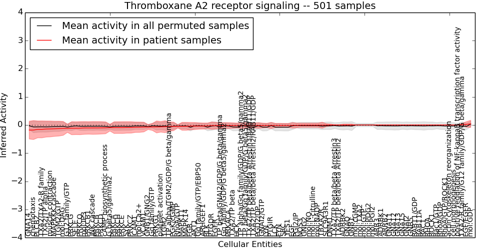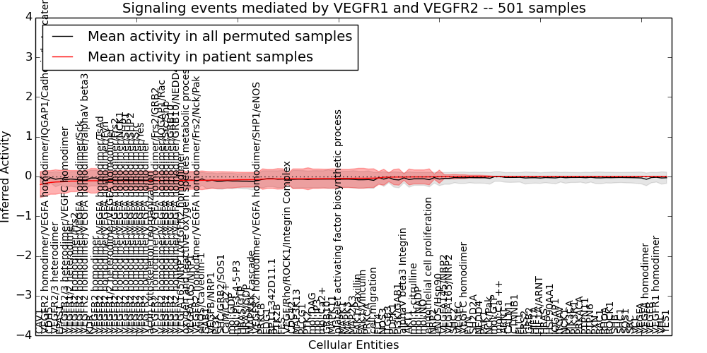 Figure S131. Get High-res Image This plot shows pathway concept perturbations across all samples against a permutation model. The concepts along the x-axis are sorted by lowest to highest mean activity for the real patient samples. Mean inferred activities are plotted along the y-axis as a colored band showing the average level and one standard deviation range. Real samples are shown in red and permuted samples in black.