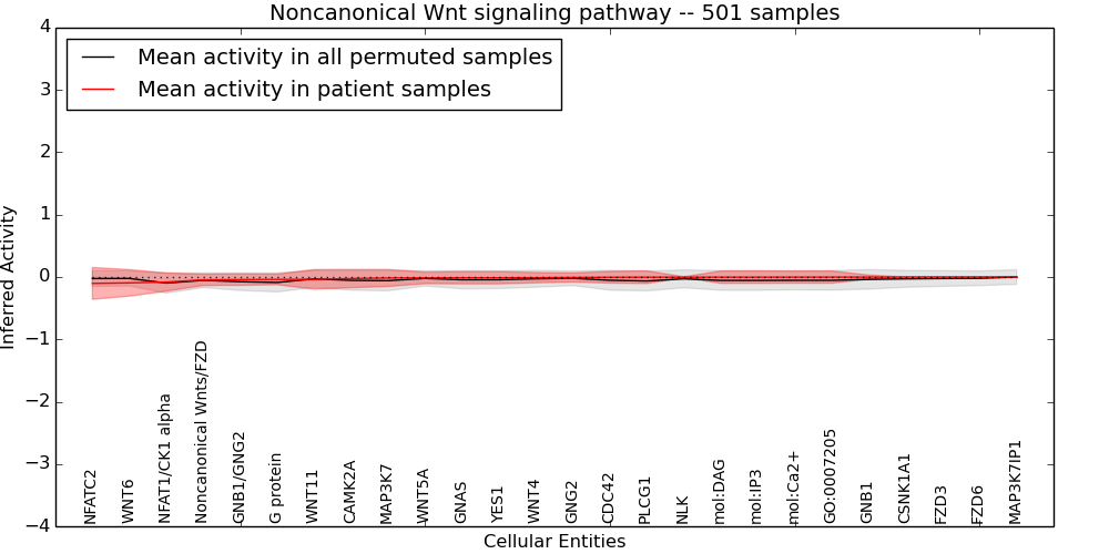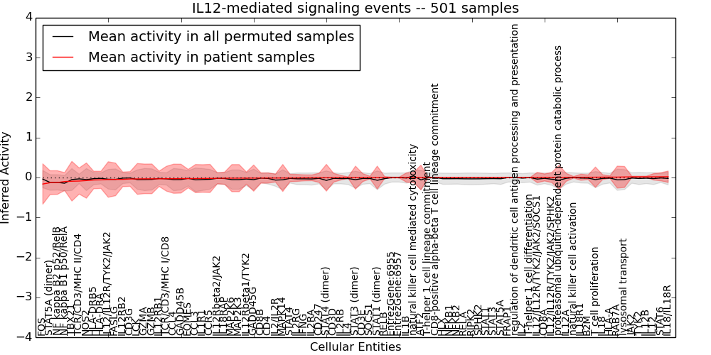 Figure S128. Get High-res Image This plot shows pathway concept perturbations across all samples against a permutation model. The concepts along the x-axis are sorted by lowest to highest mean activity for the real patient samples. Mean inferred activities are plotted along the y-axis as a colored band showing the average level and one standard deviation range. Real samples are shown in red and permuted samples in black.