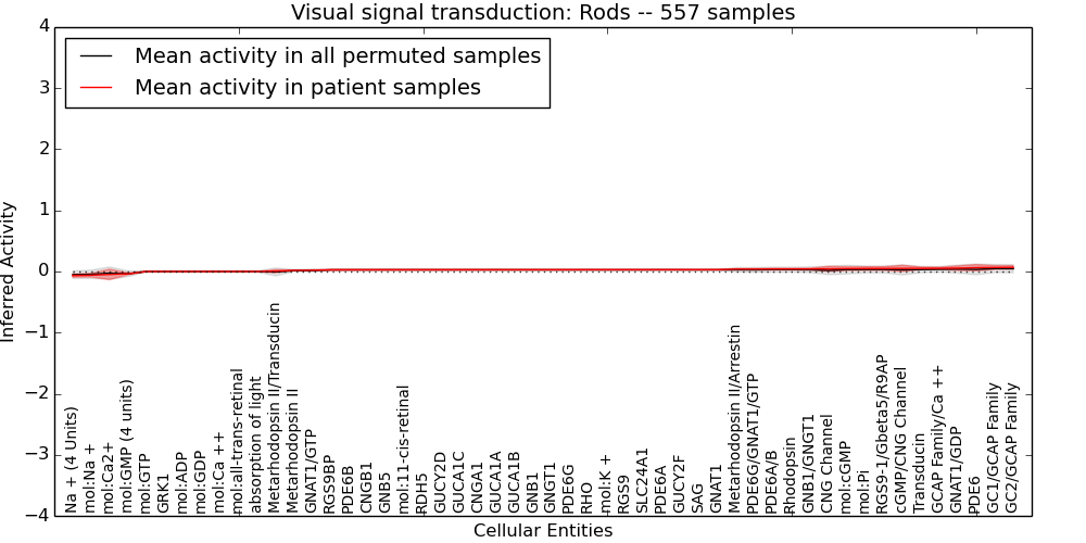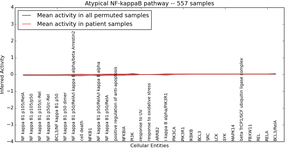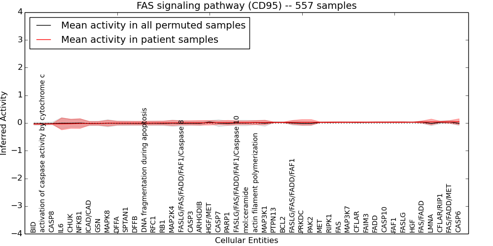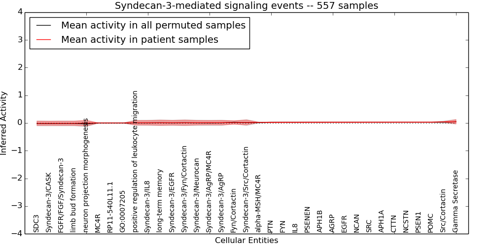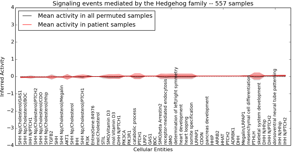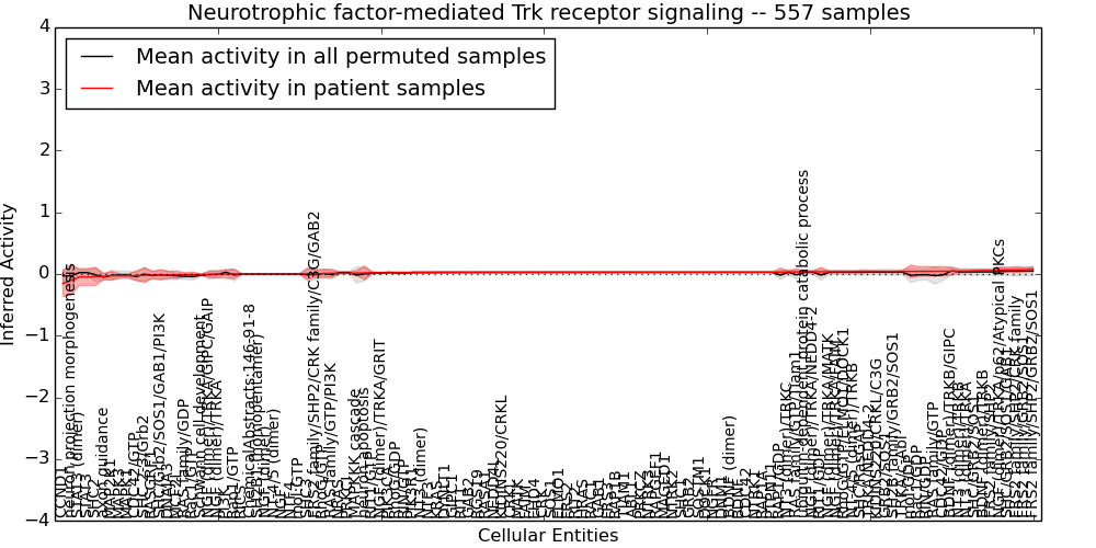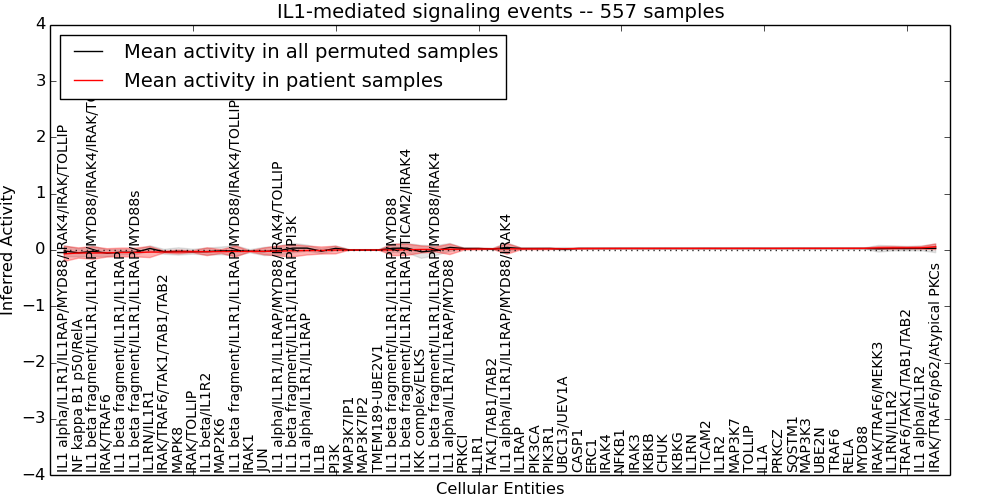 Figure S131.  Get High-res Image This plot shows pathway concept perturbations across all samples against a permutation model. The concepts along the x-axis are sorted by lowest to highest mean activity for the real patient samples. Mean inferred activities are plotted along the y-axis as a colored band showing the average level and one standard deviation range. Real samples are shown in red and permuted samples in black.