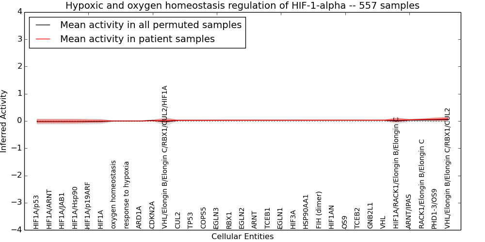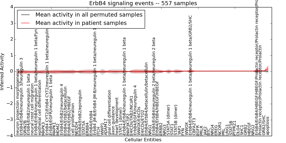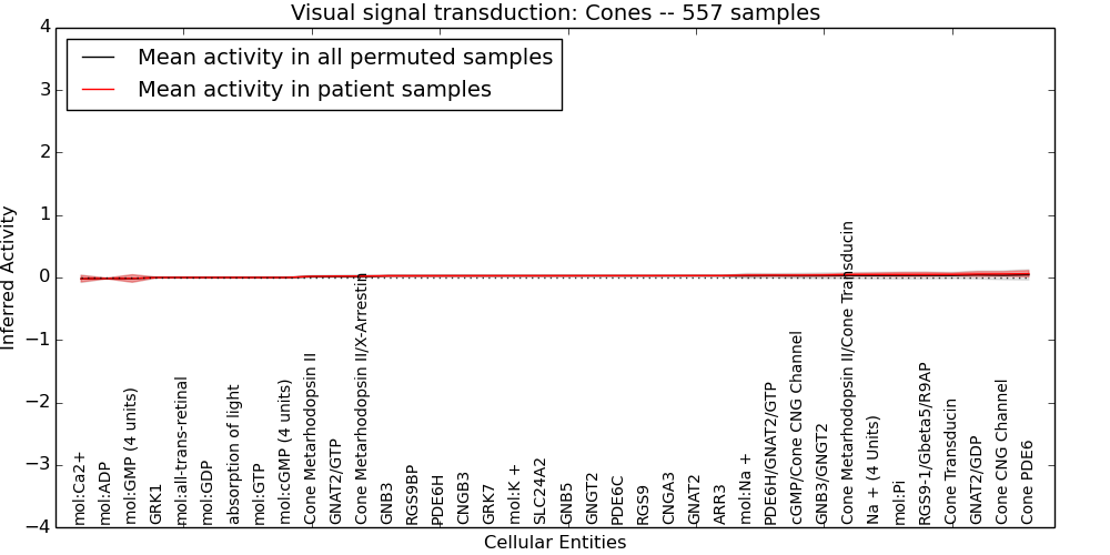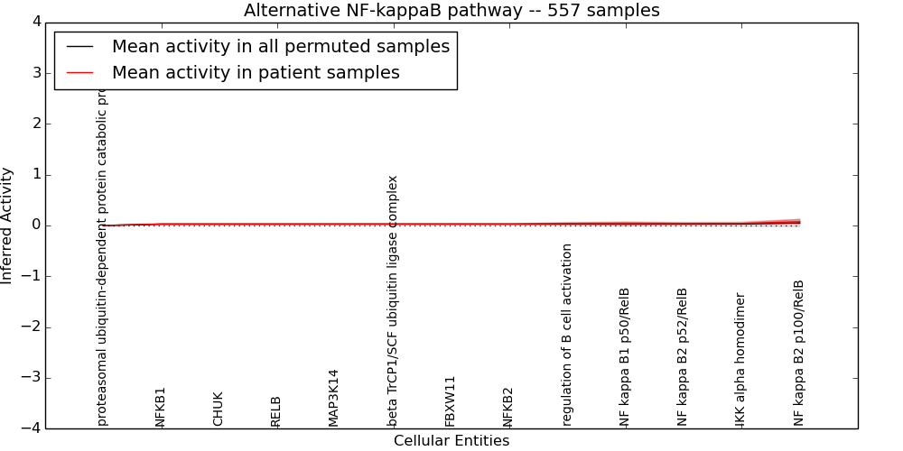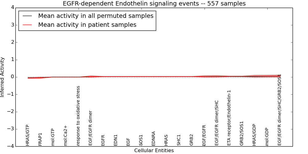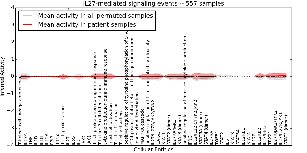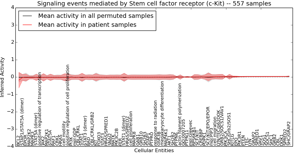 Figure S131.  Get High-res Image This plot shows pathway concept perturbations across all samples against a permutation model. The concepts along the x-axis are sorted by lowest to highest mean activity for the real patient samples. Mean inferred activities are plotted along the y-axis as a colored band showing the average level and one standard deviation range. Real samples are shown in red and permuted samples in black.