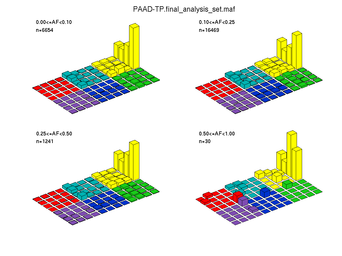 The mutation spectrum is depicted in the lego plots below in which the 96 possible mutation types are subdivided into six large blocks, color-coded to reflect the base substitution type. Each large block is further subdivided into the 16 possible pairs of 5' and 3' neighbors, as listed in the 4x4 trinucleotide context legend. The height of each block corresponds to the mutation frequency for that kind of mutation (counts of mutations normalized by the base coverage in a given bin). The shape of the spectrum is a signature for dominant mutational mechanisms in different tumor types.