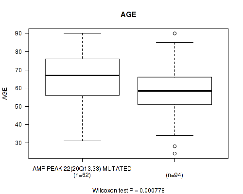 Table S3. Gene #22: 'amp_20q13.33' versus Clinical Feature #2: 'AGE'