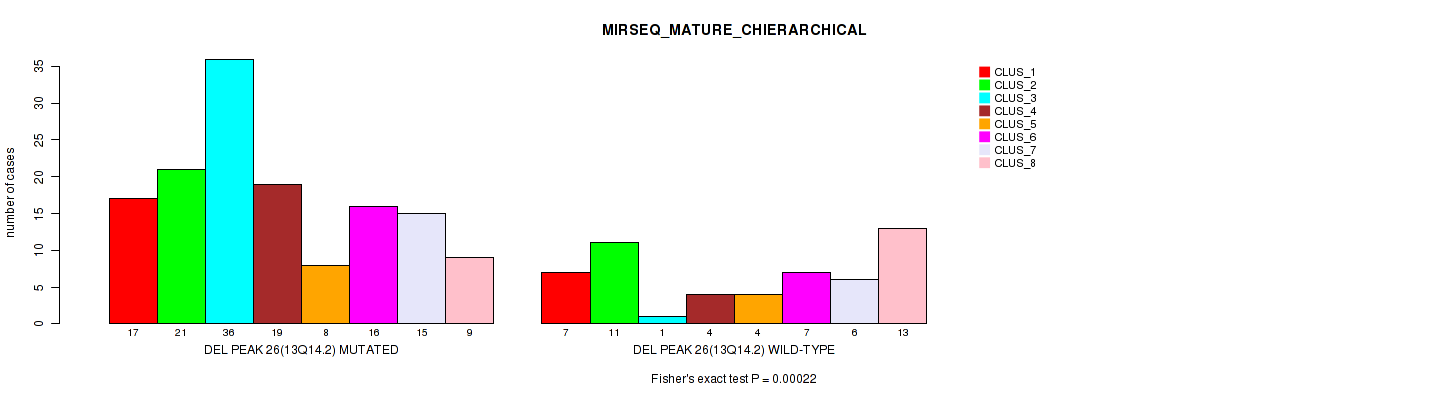 del_13q14.2 cnv correlated to 'CN_CNMF', 'METHLYATION_CNMF', 'MRNASEQ_CNMF', 'MRNASEQ_CHIERARCHICAL', 'MIRSEQ_CNMF', 'MIRSEQ_CHIERARCHICAL', 'MIRSEQ_MATURE_CNMF', and 'MIRSEQ_MATURE_CHIERARCHICAL'.