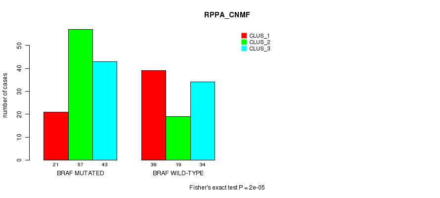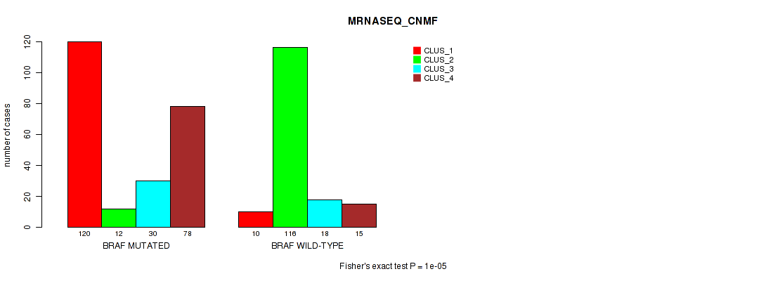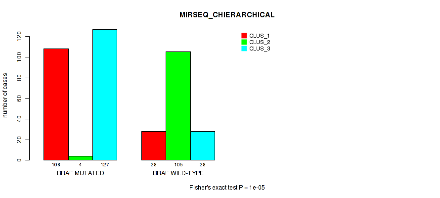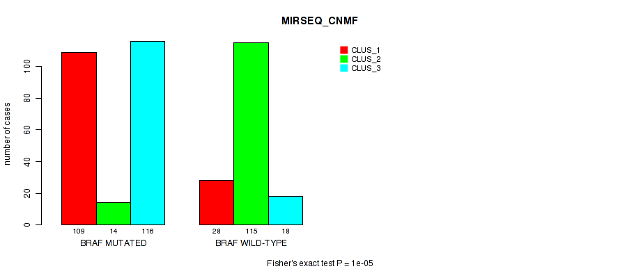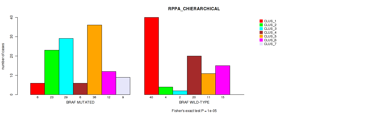 BRAF mutation correlated to 'CN_CNMF', 'METHLYATION_CNMF', 'RPPA_CNMF', 'RPPA_CHIERARCHICAL', 'MRNASEQ_CNMF', 'MRNASEQ_CHIERARCHICAL', 'MIRSEQ_CNMF', 'MIRSEQ_CHIERARCHICAL', 'MIRSEQ_MATURE_CNMF', and 'MIRSEQ_MATURE_CHIERARCHICAL'.