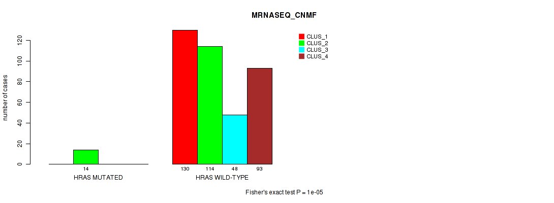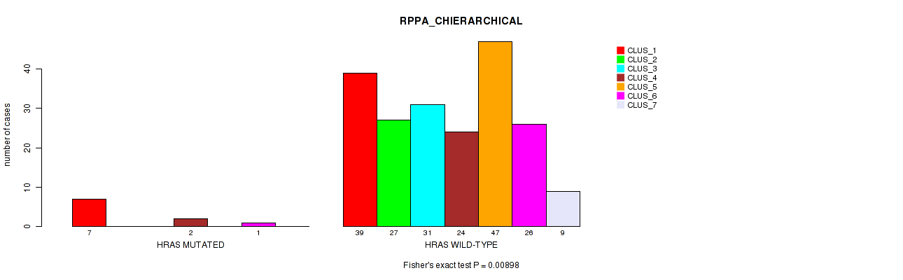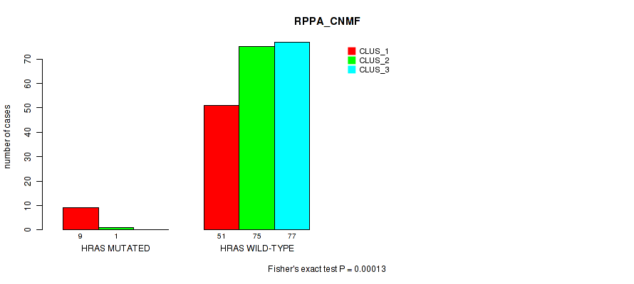 HRAS mutation correlated to 'CN_CNMF', 'METHLYATION_CNMF', 'RPPA_CNMF', 'MRNASEQ_CNMF', 'MRNASEQ_CHIERARCHICAL', 'MIRSEQ_CNMF', 'MIRSEQ_CHIERARCHICAL', 'MIRSEQ_MATURE_CNMF', and 'MIRSEQ_MATURE_CHIERARCHICAL'.