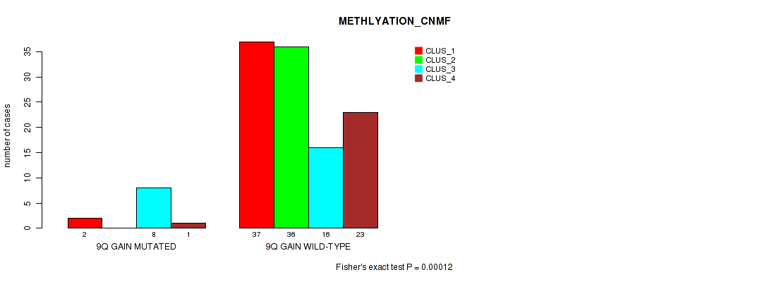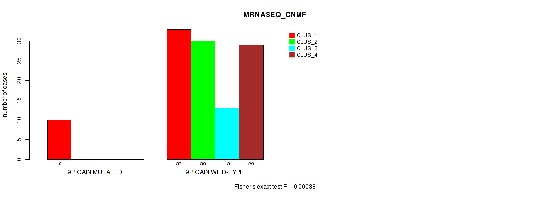 9p gain cnv correlated to 'CN_CNMF', 'METHLYATION_CNMF', 'MRNASEQ_CNMF', and 'MRNASEQ_CHIERARCHICAL'.