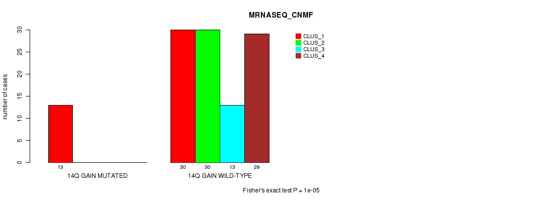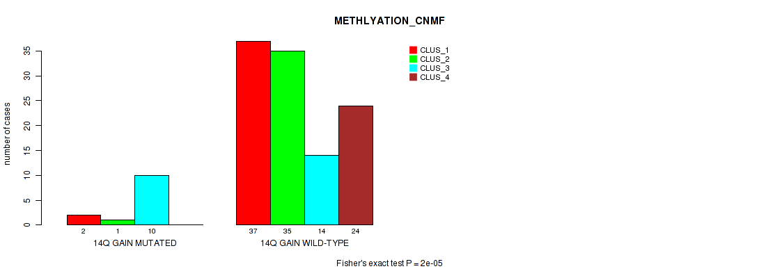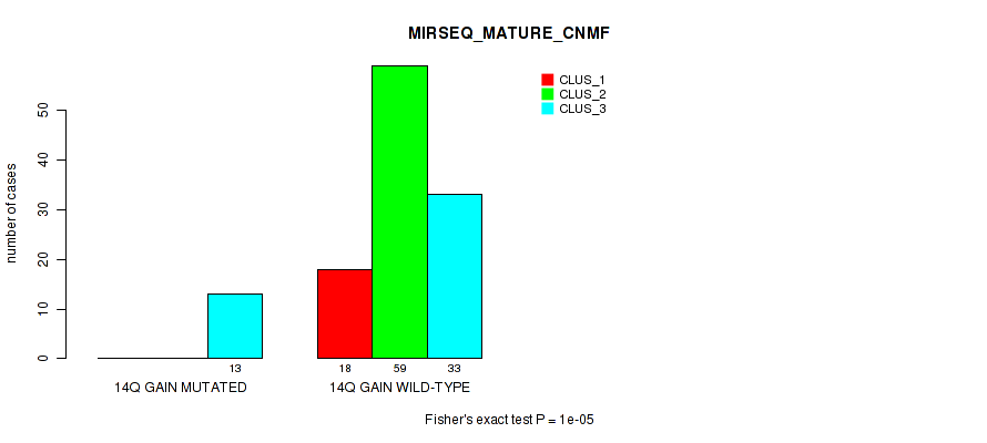 14q gain cnv correlated to 'CN_CNMF', 'METHLYATION_CNMF', 'MRNASEQ_CNMF', 'MRNASEQ_CHIERARCHICAL', 'MIRSEQ_CNMF', 'MIRSEQ_CHIERARCHICAL', 'MIRSEQ_MATURE_CNMF', and 'MIRSEQ_MATURE_CHIERARCHICAL'.