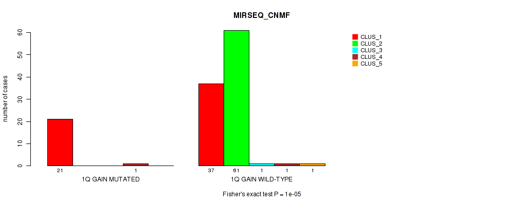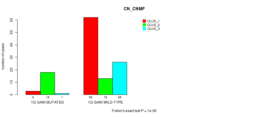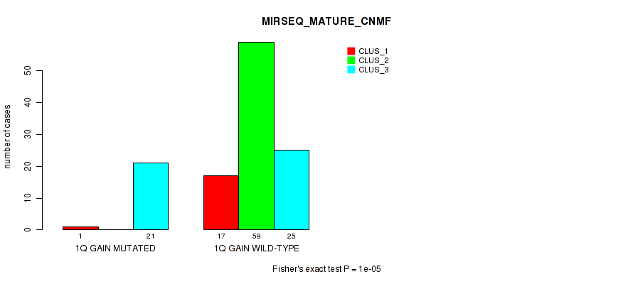 1q gain cnv correlated to 'CN_CNMF', 'METHLYATION_CNMF', 'MRNASEQ_CNMF', 'MRNASEQ_CHIERARCHICAL', 'MIRSEQ_CNMF', 'MIRSEQ_CHIERARCHICAL', 'MIRSEQ_MATURE_CNMF', and 'MIRSEQ_MATURE_CHIERARCHICAL'.