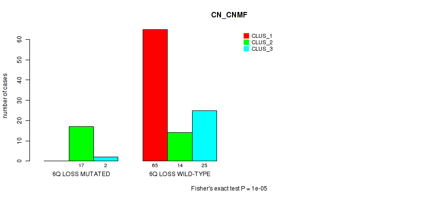 6q loss cnv correlated to 'CN_CNMF', 'METHLYATION_CNMF', 'MRNASEQ_CNMF', 'MRNASEQ_CHIERARCHICAL', 'MIRSEQ_CNMF', 'MIRSEQ_CHIERARCHICAL', 'MIRSEQ_MATURE_CNMF', and 'MIRSEQ_MATURE_CHIERARCHICAL'.