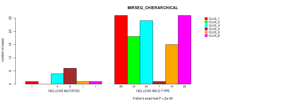Table S105. Gene #41: '16q loss' versus Molecular Subtype #6: 'MIRSEQ_CHIERARCHICAL'
