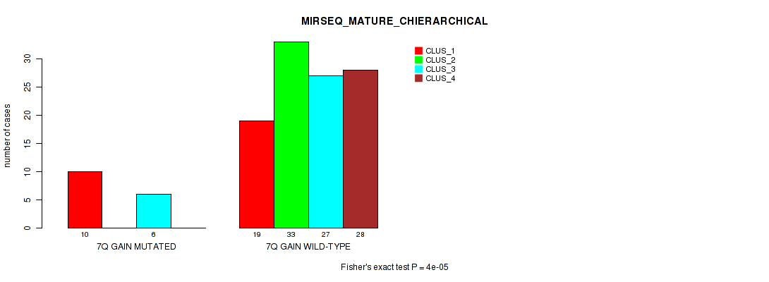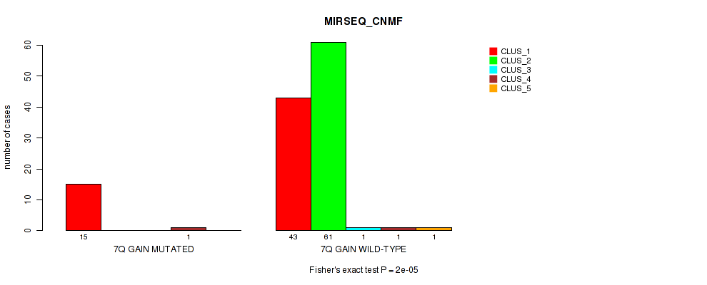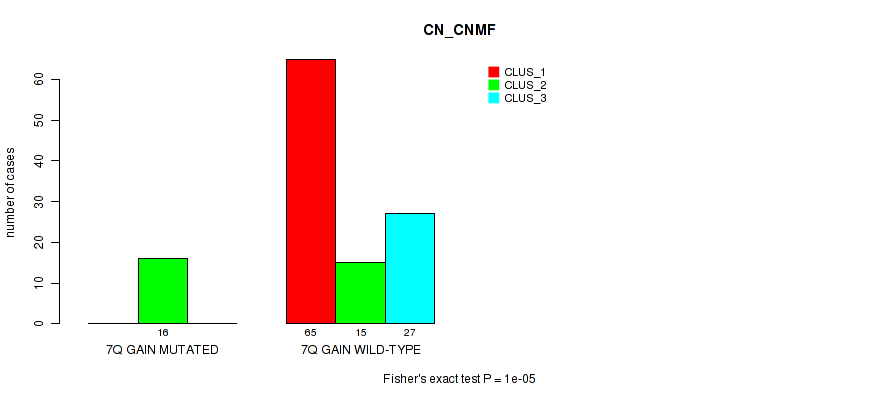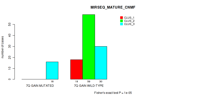 7q gain cnv correlated to 'CN_CNMF', 'METHLYATION_CNMF', 'MRNASEQ_CNMF', 'MRNASEQ_CHIERARCHICAL', 'MIRSEQ_CNMF', 'MIRSEQ_CHIERARCHICAL', 'MIRSEQ_MATURE_CNMF', and 'MIRSEQ_MATURE_CHIERARCHICAL'.