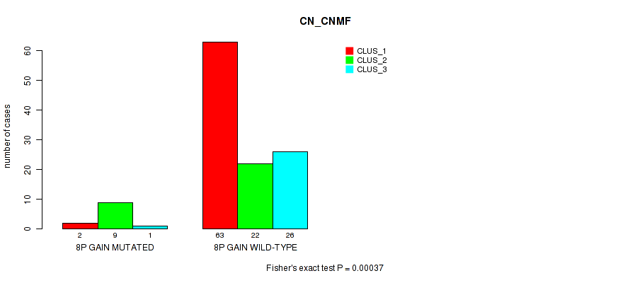 8p gain cnv correlated to 'CN_CNMF', 'MRNASEQ_CNMF', 'MRNASEQ_CHIERARCHICAL', 'MIRSEQ_CNMF', 'MIRSEQ_MATURE_CNMF', and 'MIRSEQ_MATURE_CHIERARCHICAL'.