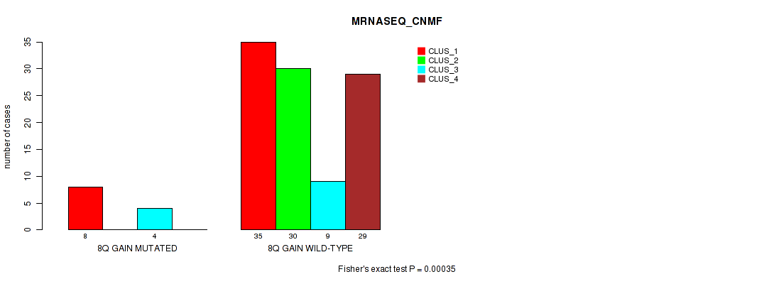 8q gain cnv correlated to 'CN_CNMF', 'MRNASEQ_CNMF', 'MRNASEQ_CHIERARCHICAL', 'MIRSEQ_CNMF', 'MIRSEQ_MATURE_CNMF', and 'MIRSEQ_MATURE_CHIERARCHICAL'.
