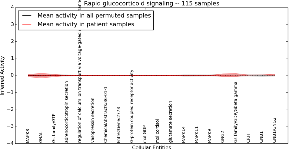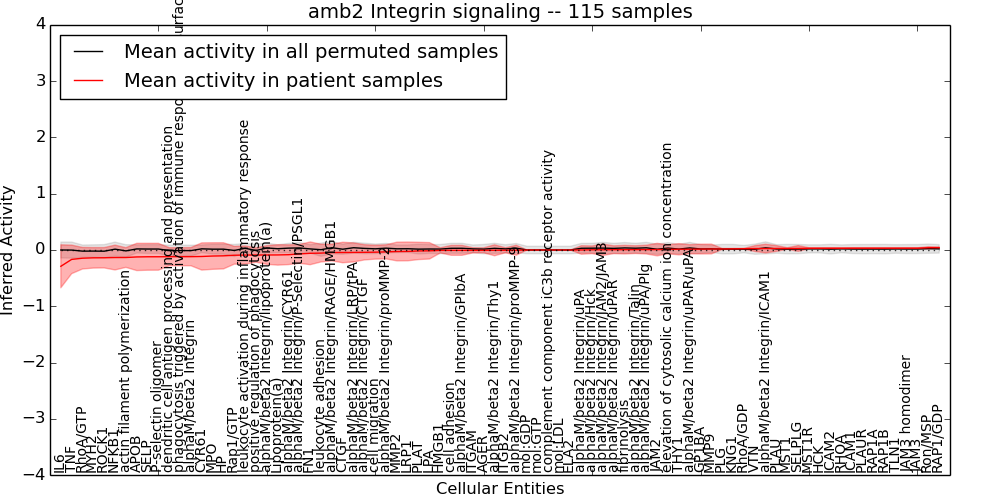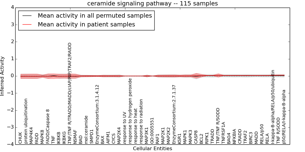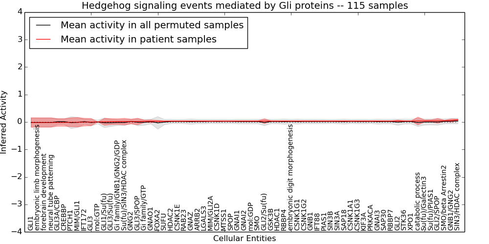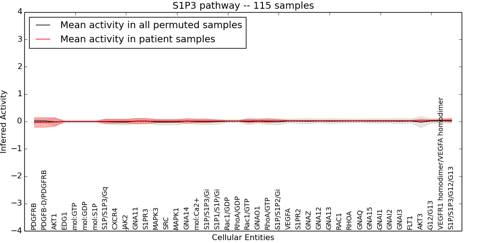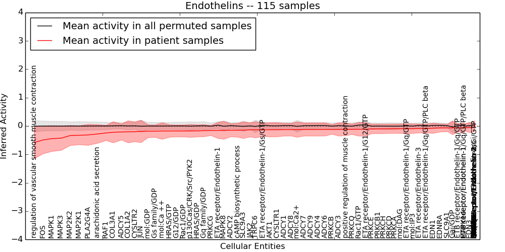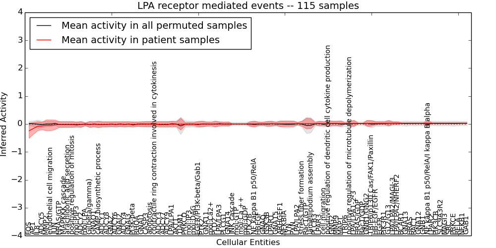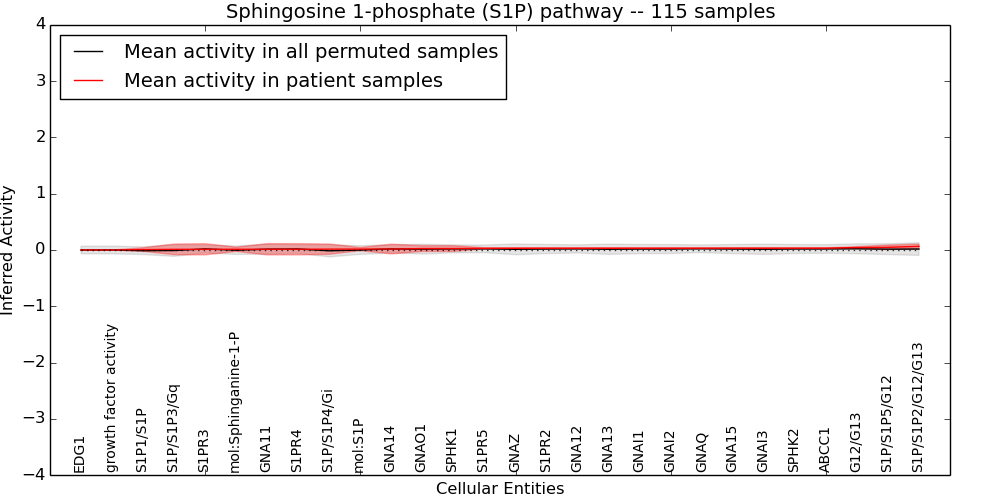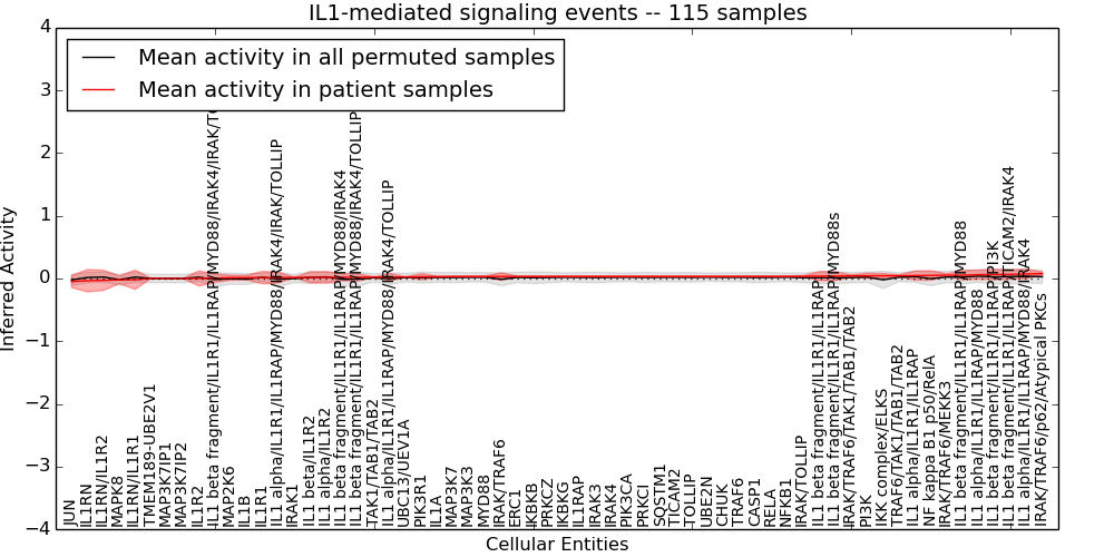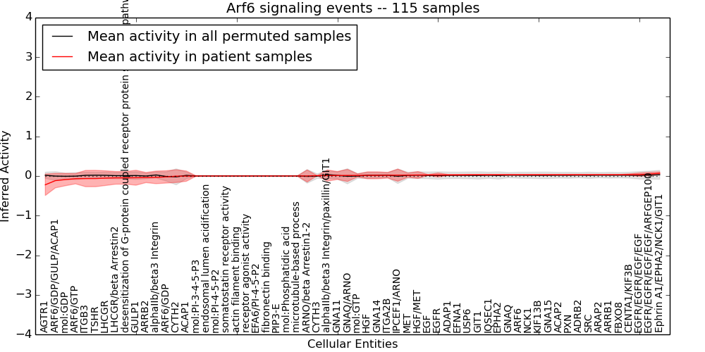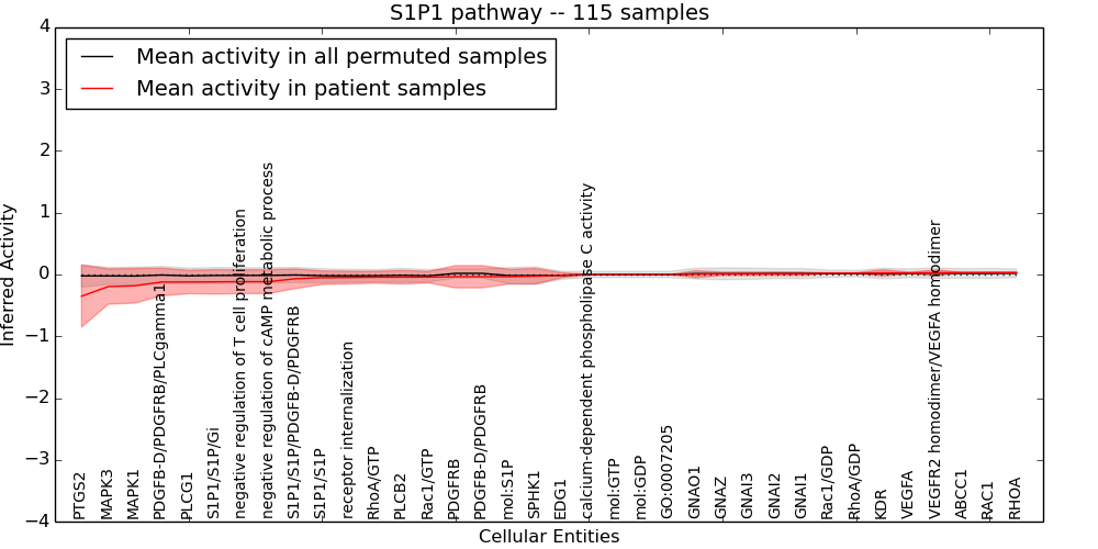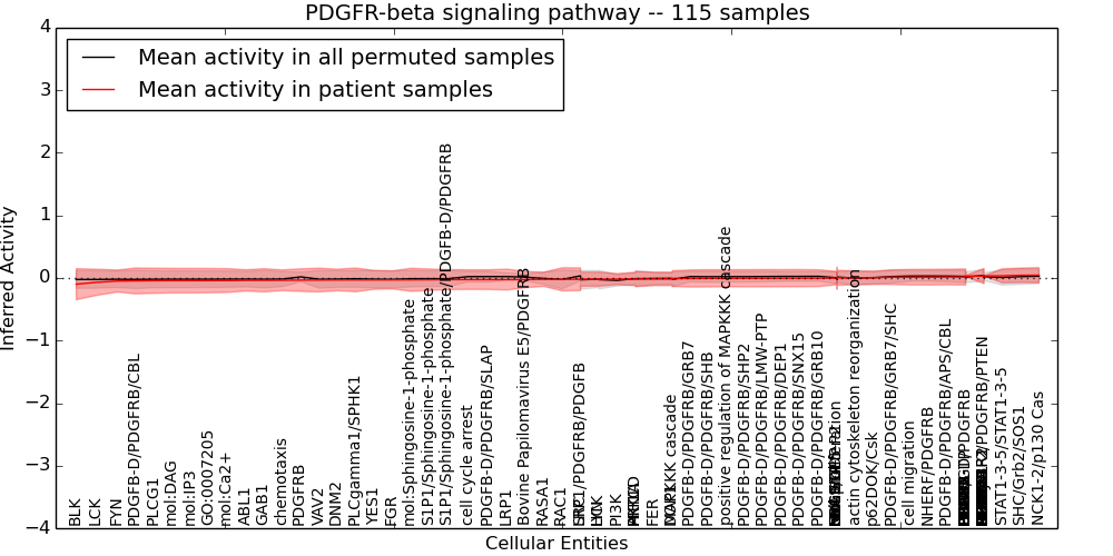 Figure S131. Get High-res Image This plot shows pathway concept perturbations across all samples against a permutation model. The concepts along the x-axis are sorted by lowest to highest mean activity for the real patient samples. Mean inferred activities are plotted along the y-axis as a colored band showing the average level and one standard deviation range. Real samples are shown in red and permuted samples in black.