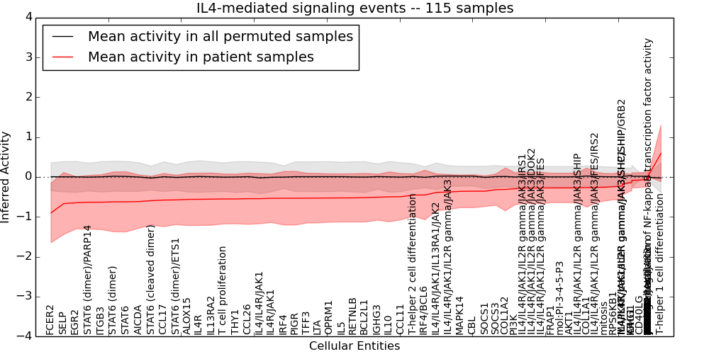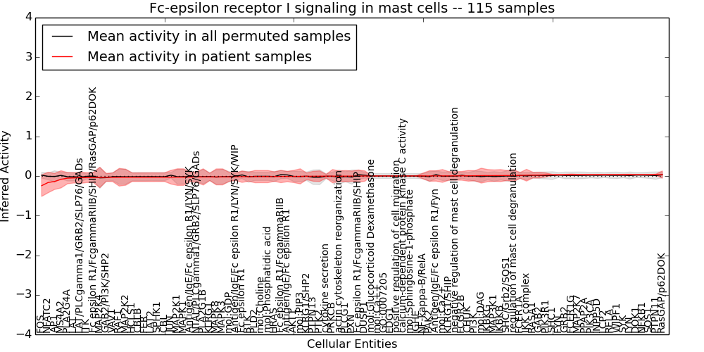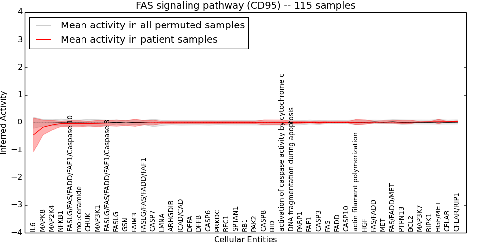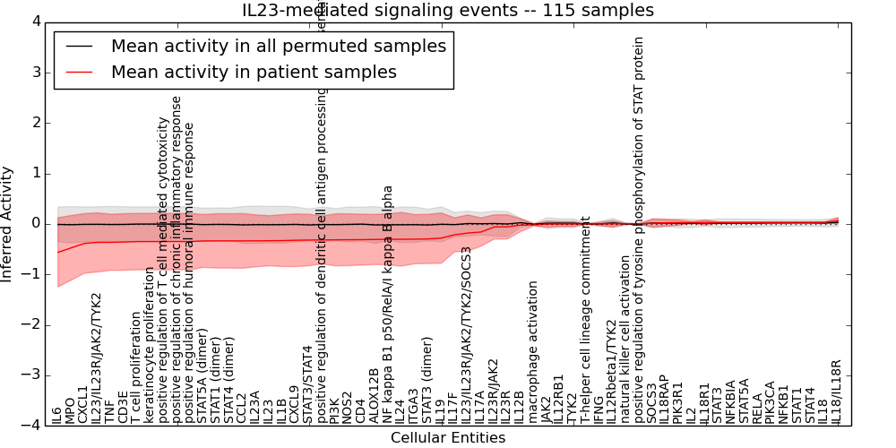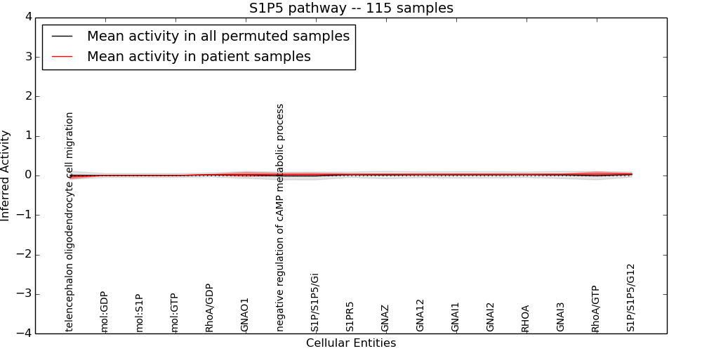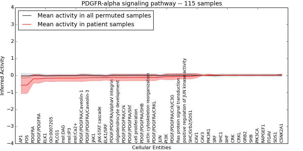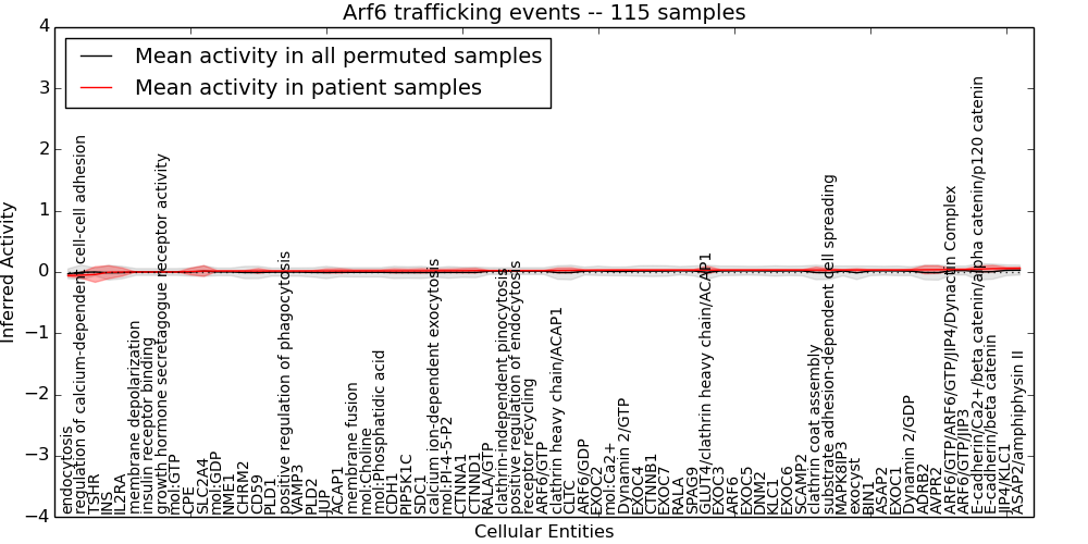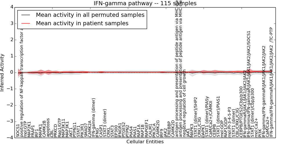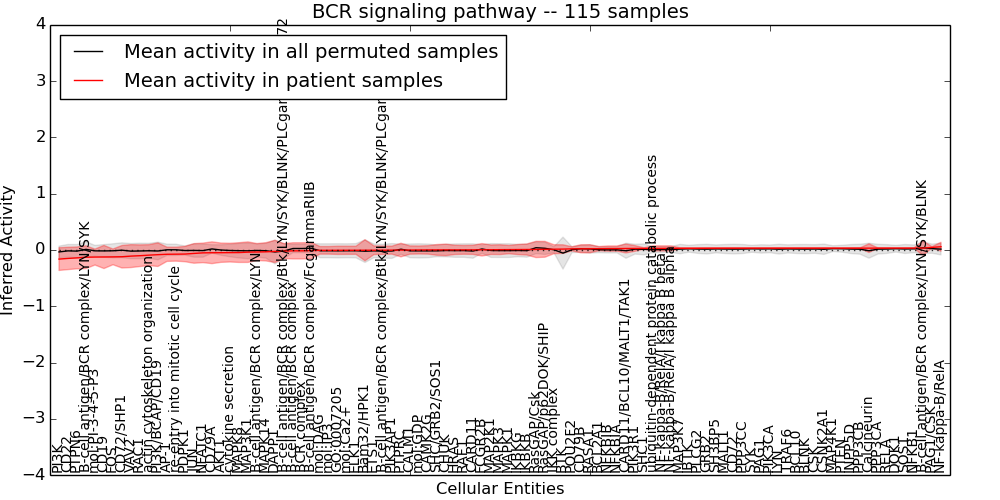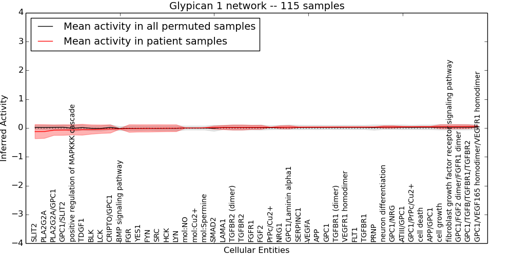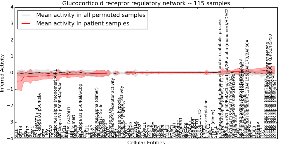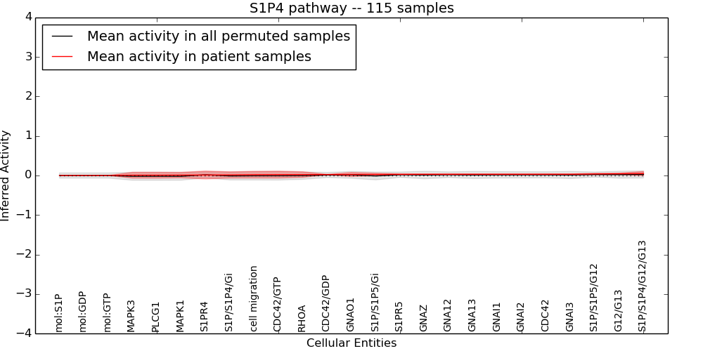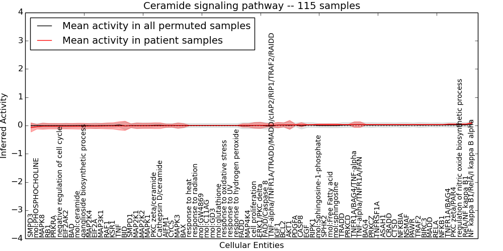 Figure S131. Get High-res Image This plot shows pathway concept perturbations across all samples against a permutation model. The concepts along the x-axis are sorted by lowest to highest mean activity for the real patient samples. Mean inferred activities are plotted along the y-axis as a colored band showing the average level and one standard deviation range. Real samples are shown in red and permuted samples in black.