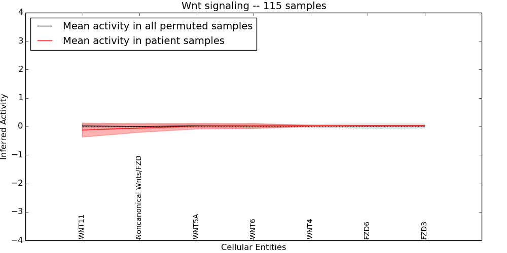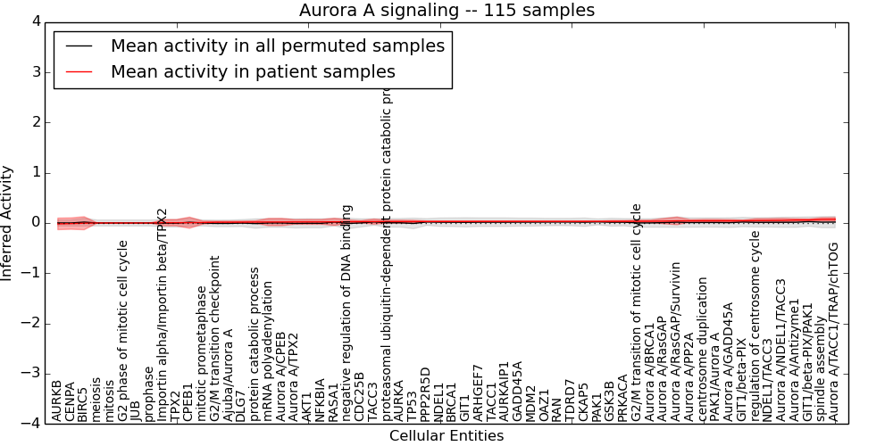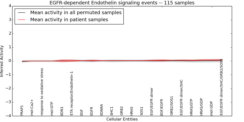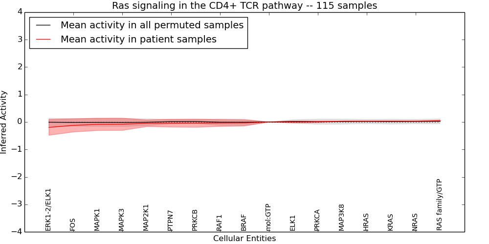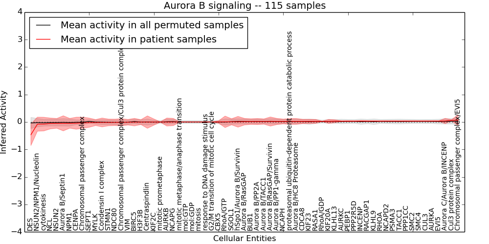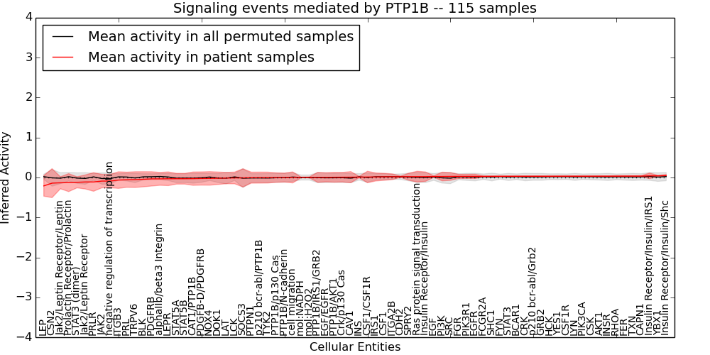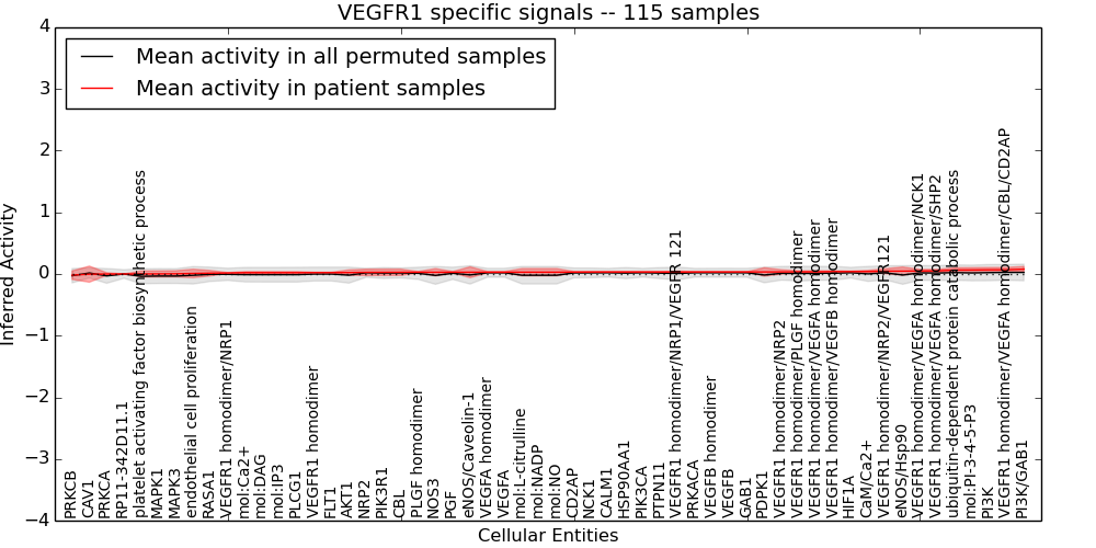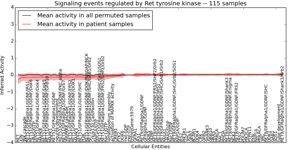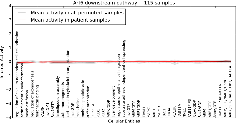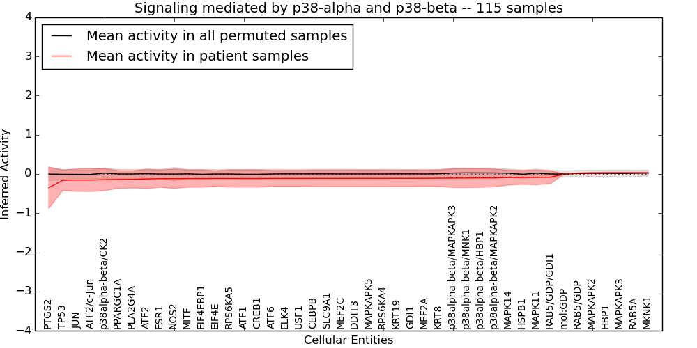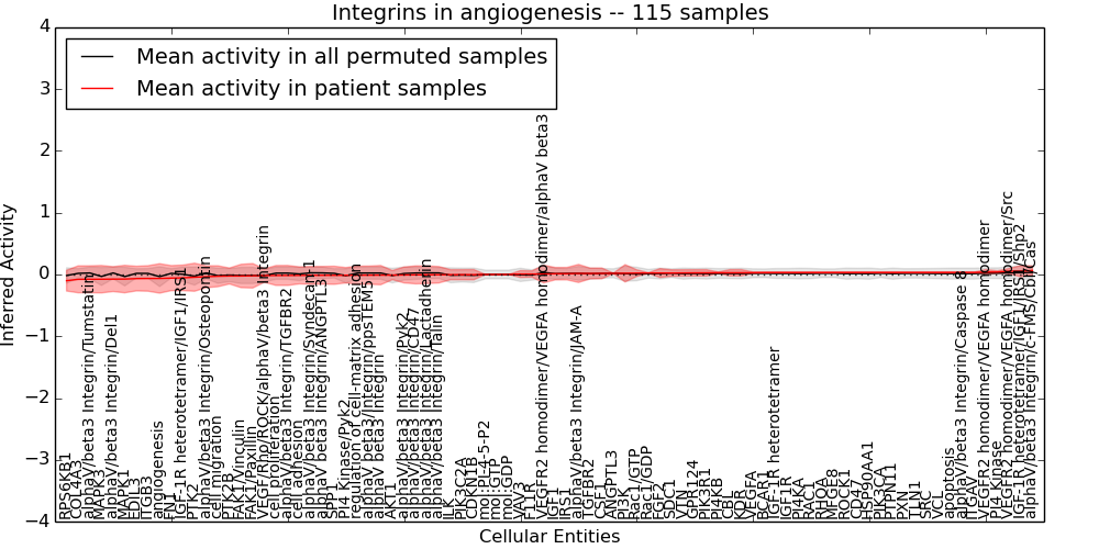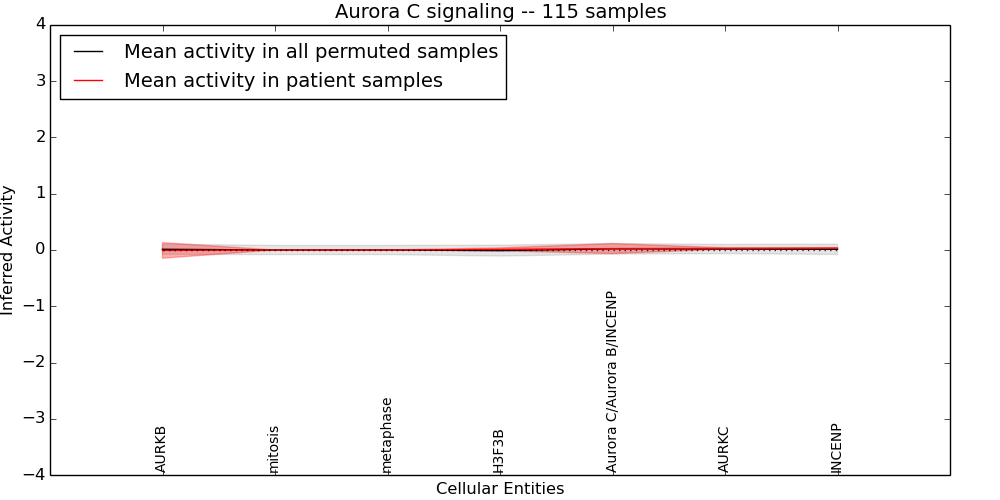 Figure S131. Get High-res Image This plot shows pathway concept perturbations across all samples against a permutation model. The concepts along the x-axis are sorted by lowest to highest mean activity for the real patient samples. Mean inferred activities are plotted along the y-axis as a colored band showing the average level and one standard deviation range. Real samples are shown in red and permuted samples in black.