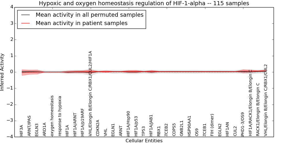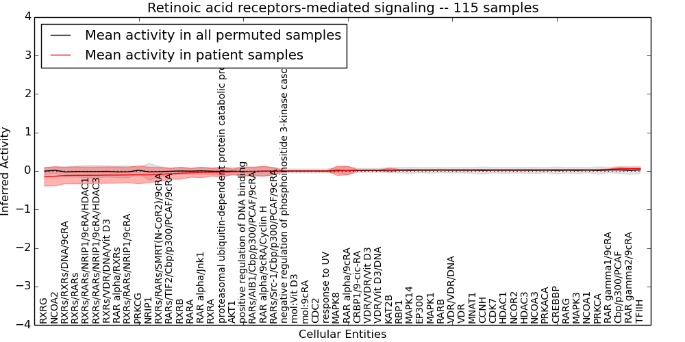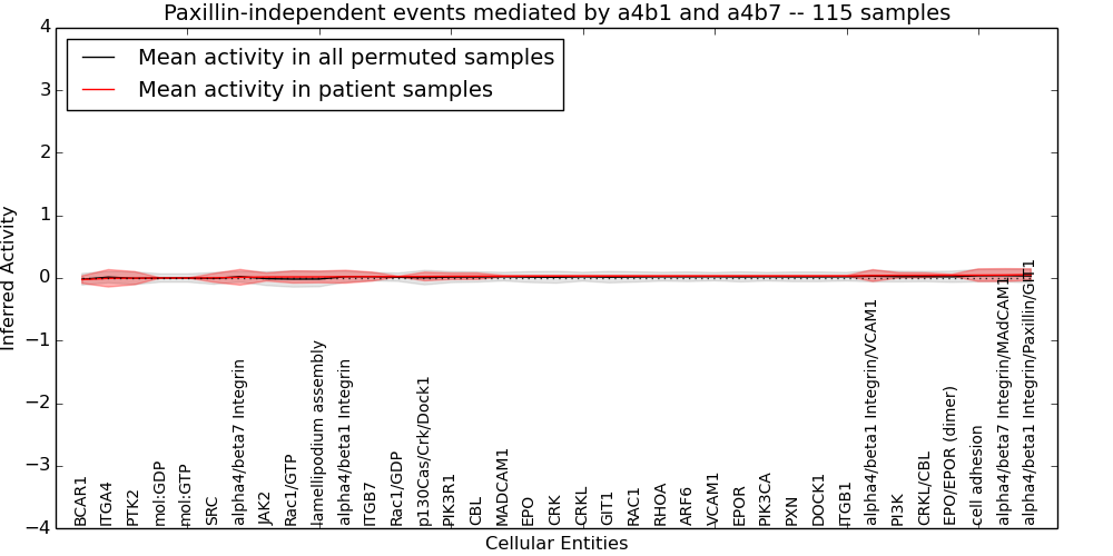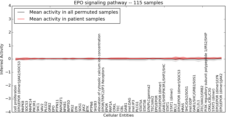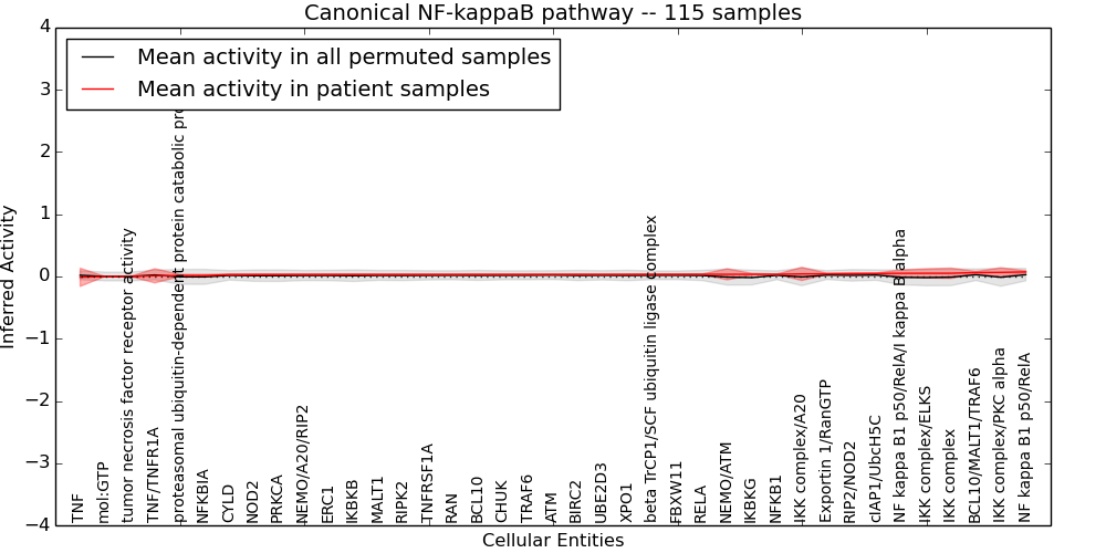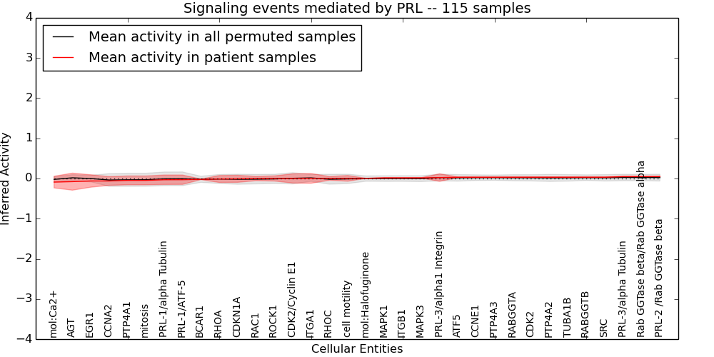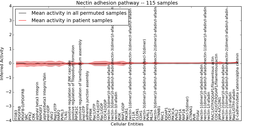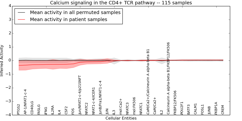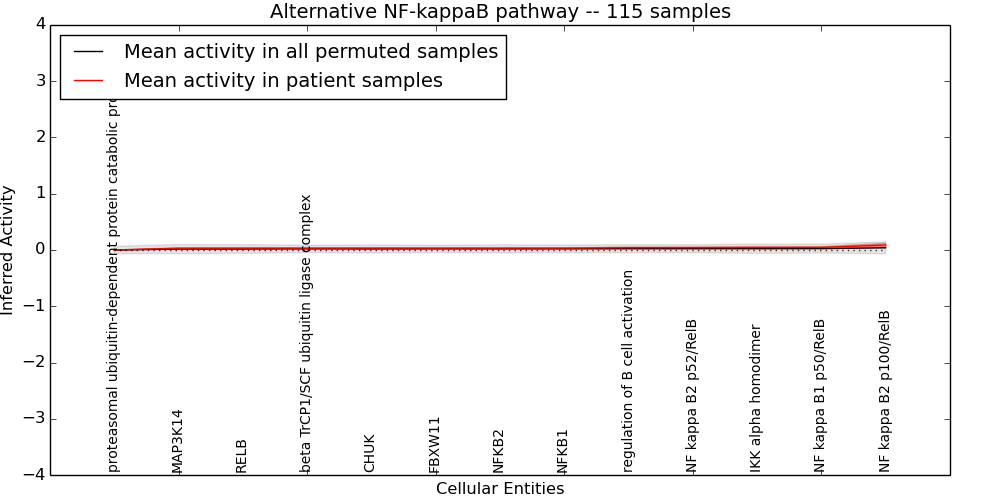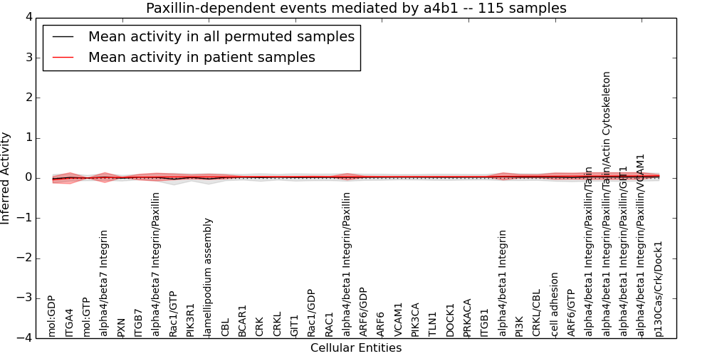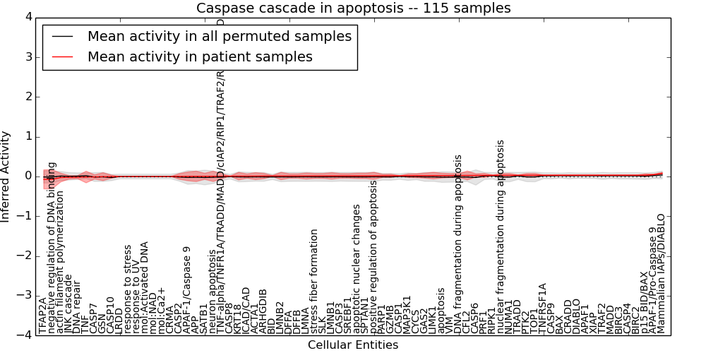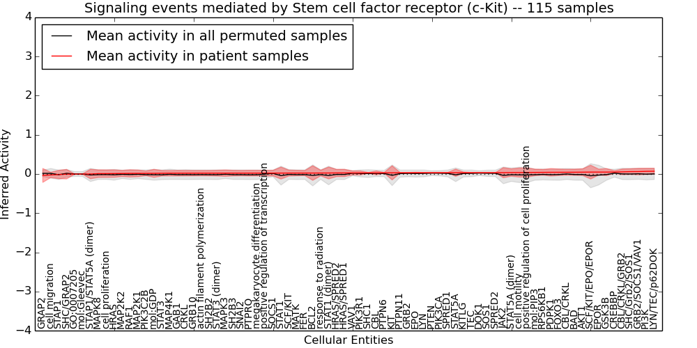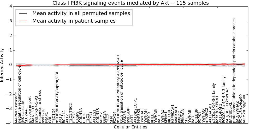 Figure S131. Get High-res Image This plot shows pathway concept perturbations across all samples against a permutation model. The concepts along the x-axis are sorted by lowest to highest mean activity for the real patient samples. Mean inferred activities are plotted along the y-axis as a colored band showing the average level and one standard deviation range. Real samples are shown in red and permuted samples in black.