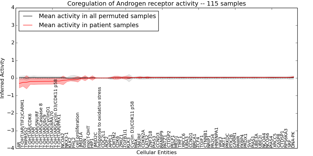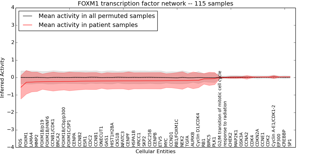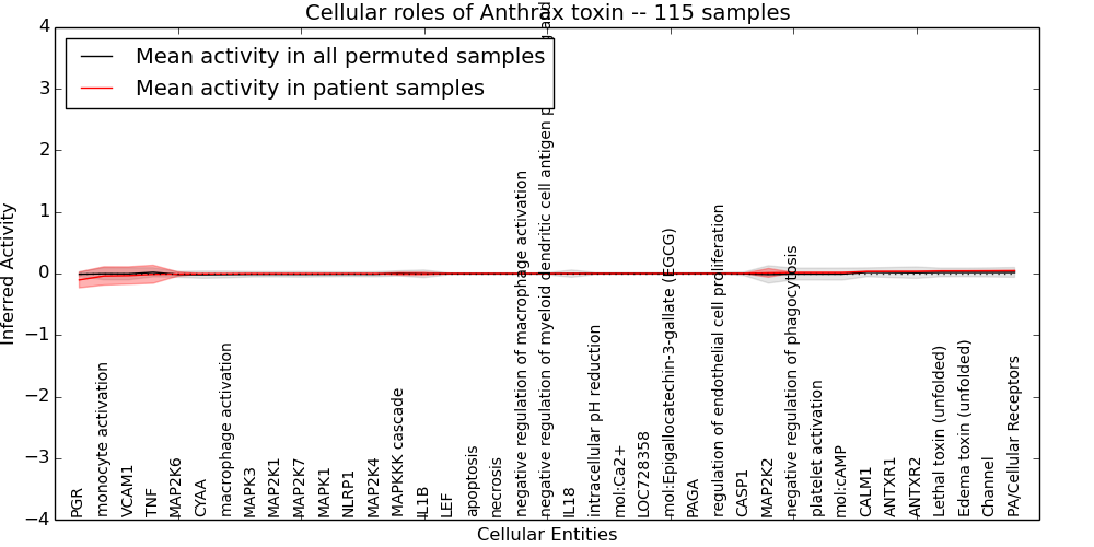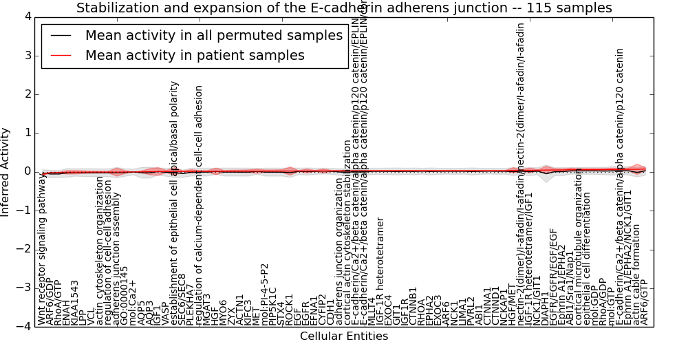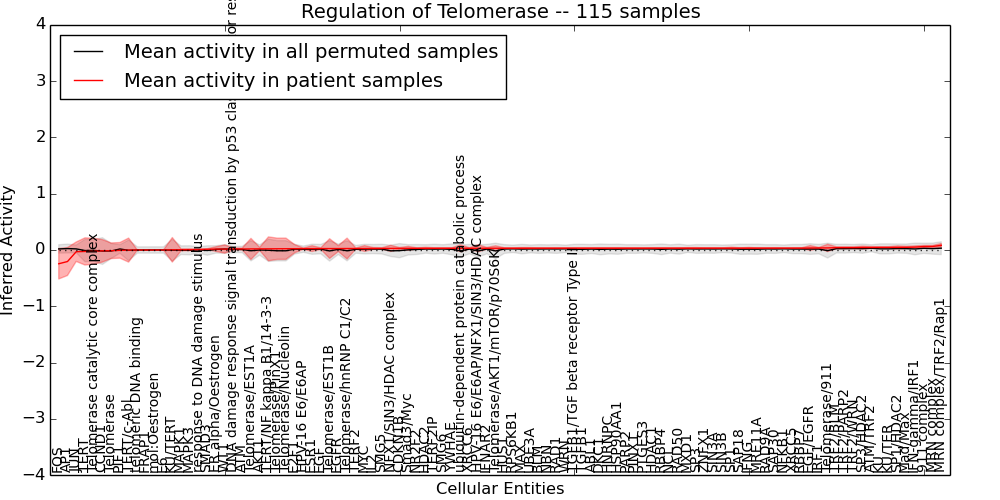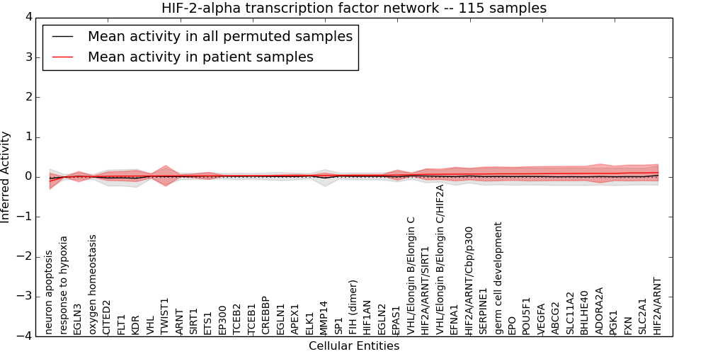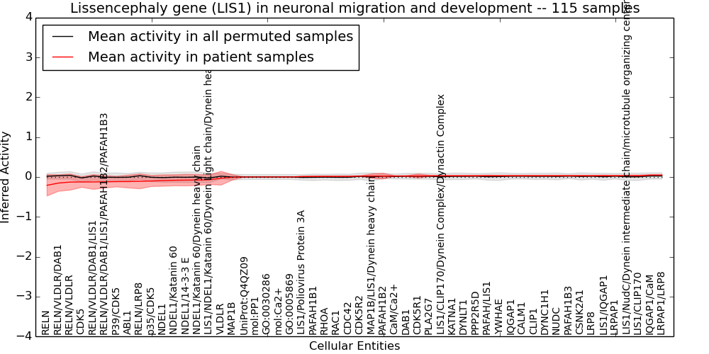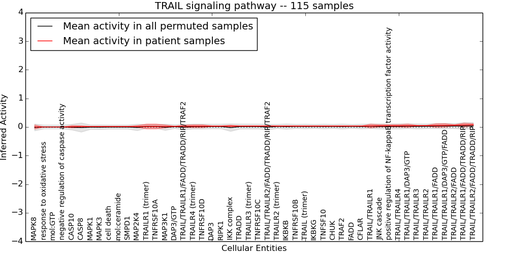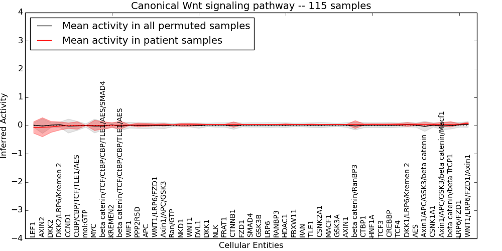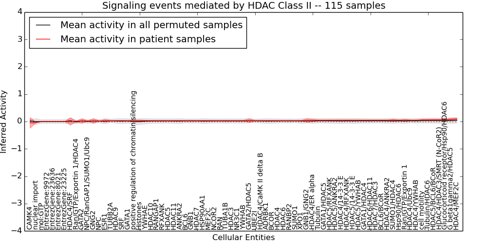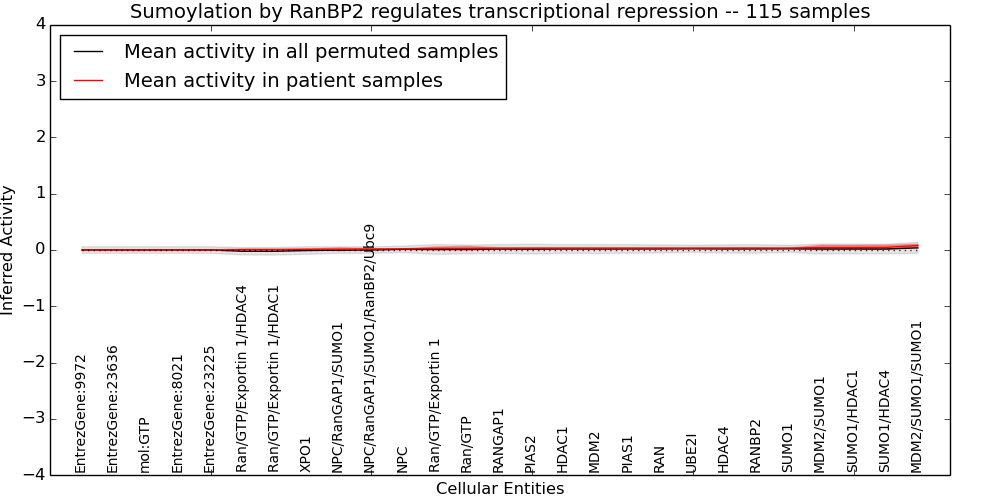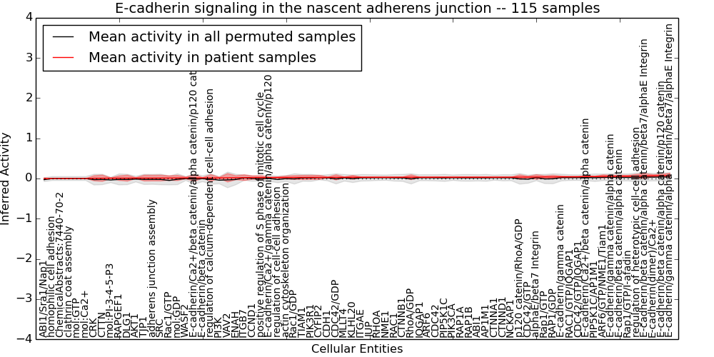 Figure S131. Get High-res Image This plot shows pathway concept perturbations across all samples against a permutation model. The concepts along the x-axis are sorted by lowest to highest mean activity for the real patient samples. Mean inferred activities are plotted along the y-axis as a colored band showing the average level and one standard deviation range. Real samples are shown in red and permuted samples in black.