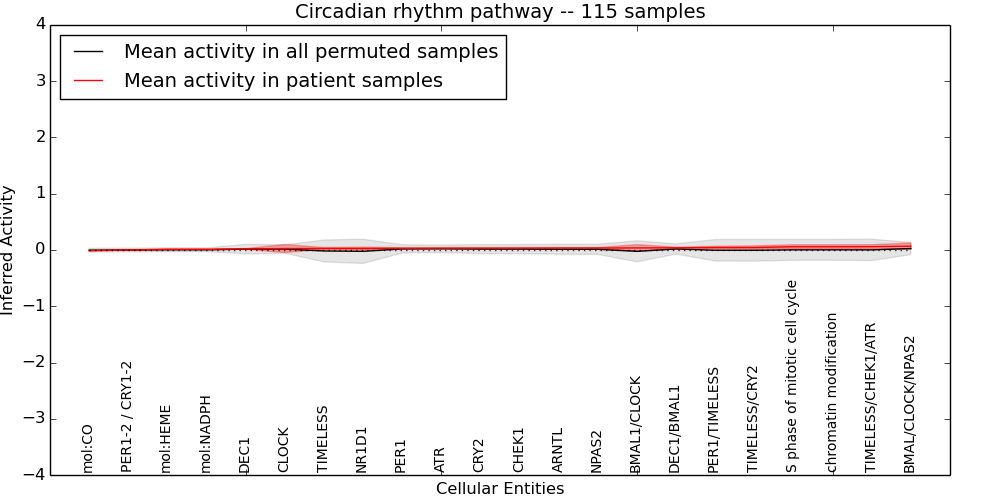 Figure S130. Get High-res Image This plot shows pathway concept perturbations across all samples against a permutation model. The concepts along the x-axis are sorted by lowest to highest mean activity for the real patient samples. Mean inferred activities are plotted along the y-axis as a colored band showing the average level and one standard deviation range. Real samples are shown in red and permuted samples in black.