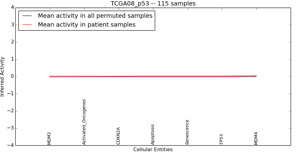 The significance of the IPL obtained for each concept in each patient sample is assessed using a permutation analysis. Importantly, the permutation analysis preserves data tuples so as to preserve any implicit correlations between the different data modalities. For example, genes that are deleted have concomitantly lower expression levels. Preserving the copy number and expression pairs therefore retains this data property. The simulation therefore makes "null samples" by permuting data tuples across all of the genes in the genome so that each gene in a null sample is associated with a random tuple of another gene with equal probability. This approach has the added benefit of preserving the pathway structure so that every observed IPL can be compared to a distribution of random IPLs derived from exactly the same interaction context. PARADIGM inferences are then obtained for 1000 "null" patients and serve as a background distribution to contrast the observed IPLs against. Pathway concepts are excluded from further analysis if they did not obtain a minimum IPL of 0.5 in any patient sample both observed or simulated.
