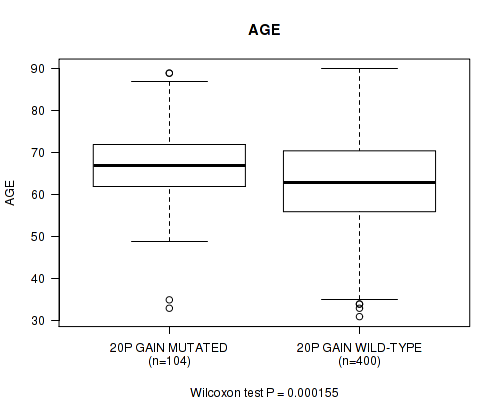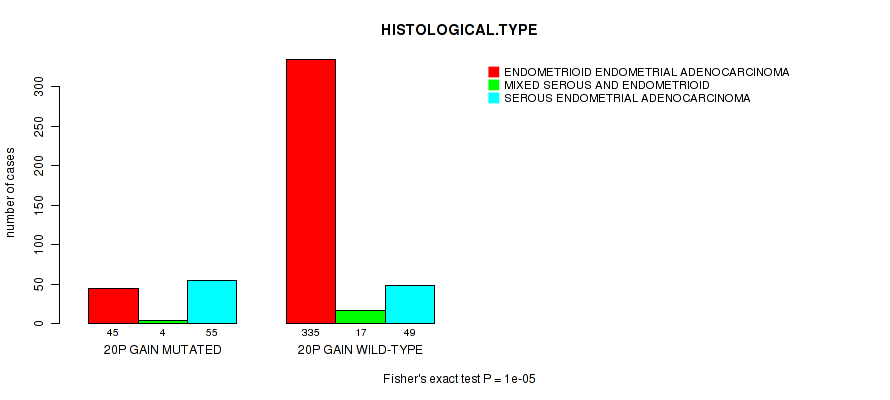 20p gain cnv correlated to 'AGE' and 'HISTOLOGICAL.TYPE'.
