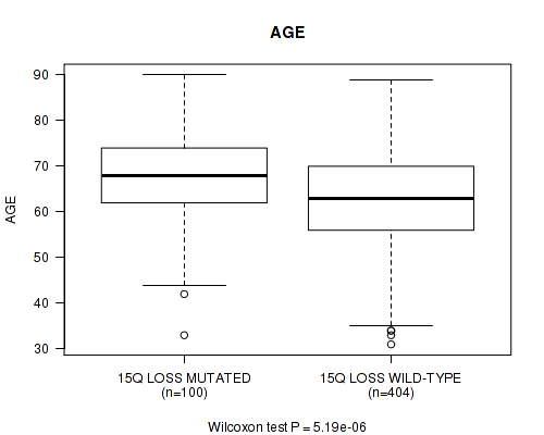 Figure S57. Get High-res Image Gene #67: '15q loss' versus Clinical Feature #2: 'AGE'