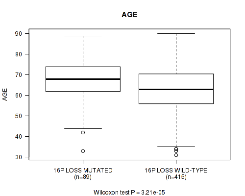 Figure S59. Get High-res Image Gene #68: '16p loss' versus Clinical Feature #2: 'AGE'