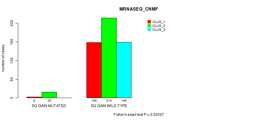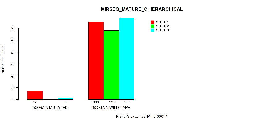5q gain cnv correlated to 'CN_CNMF', 'MRNASEQ_CNMF', 'MIRSEQ_CHIERARCHICAL', and 'MIRSEQ_MATURE_CHIERARCHICAL'.