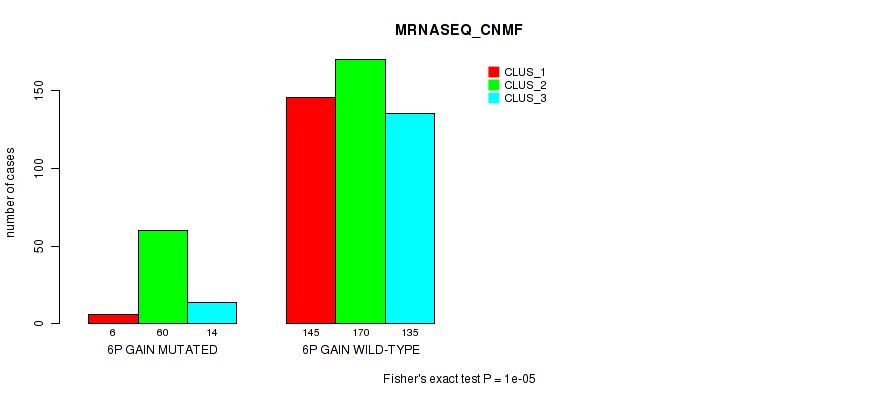 6p gain cnv correlated to 'CN_CNMF', 'METHLYATION_CNMF', 'MRNASEQ_CNMF', 'MRNASEQ_CHIERARCHICAL', 'MIRSEQ_CNMF', and 'MIRSEQ_CHIERARCHICAL'.