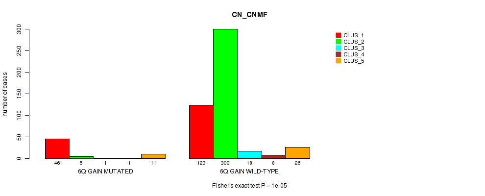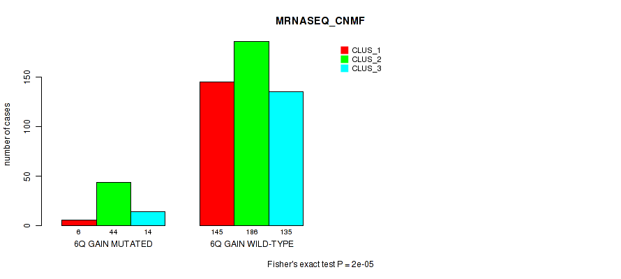 6q gain cnv correlated to 'CN_CNMF', 'MRNASEQ_CNMF', and 'MIRSEQ_CHIERARCHICAL'.
