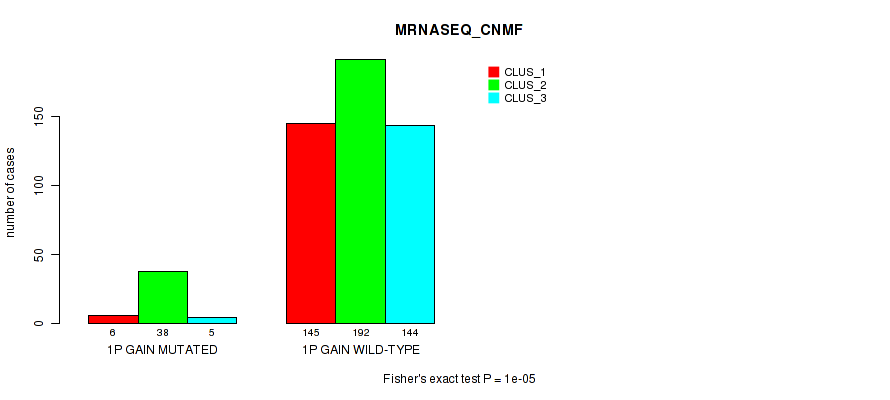 1p gain cnv correlated to 'CN_CNMF', 'METHLYATION_CNMF', 'MRNASEQ_CNMF', 'MRNASEQ_CHIERARCHICAL', 'MIRSEQ_CNMF', and 'MIRSEQ_CHIERARCHICAL'.