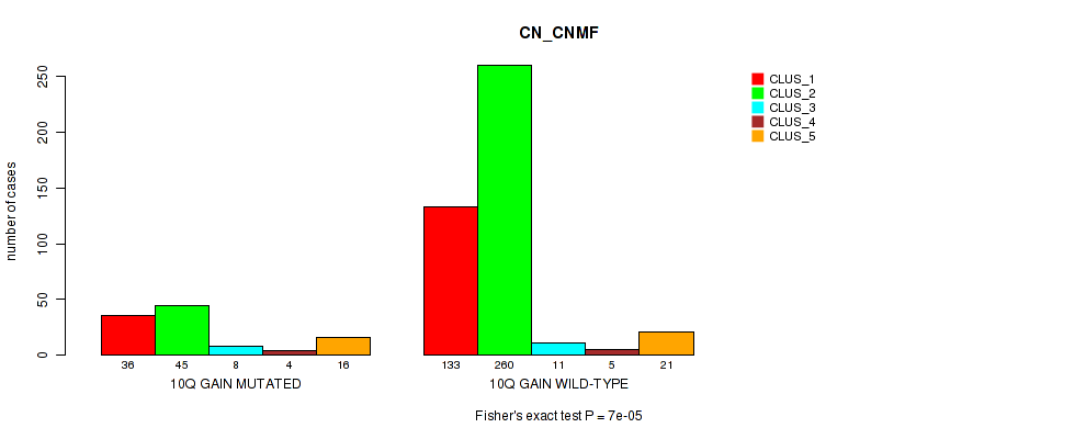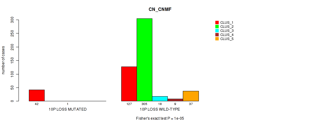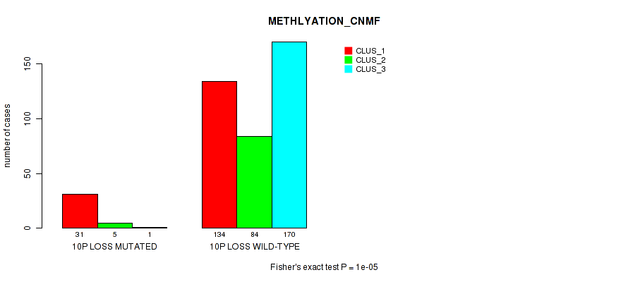 10p loss cnv correlated to 'CN_CNMF', 'METHLYATION_CNMF', 'MRNASEQ_CNMF', 'MRNASEQ_CHIERARCHICAL', 'MIRSEQ_CNMF', and 'MIRSEQ_CHIERARCHICAL'.