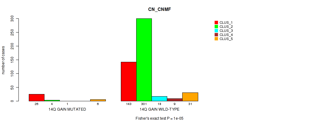 14q gain cnv correlated to 'CN_CNMF', 'MRNASEQ_CNMF', and 'MRNASEQ_CHIERARCHICAL'.