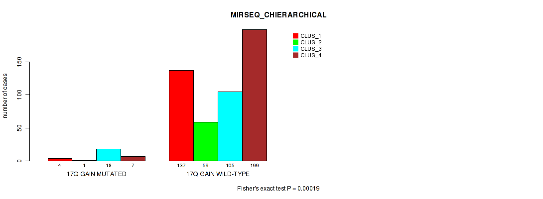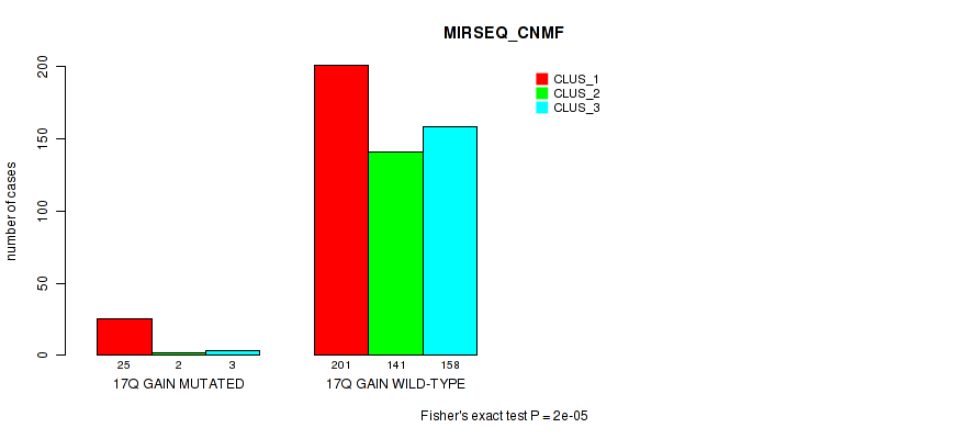 17q gain cnv correlated to 'CN_CNMF', 'METHLYATION_CNMF', 'MRNASEQ_CNMF', 'MRNASEQ_CHIERARCHICAL', 'MIRSEQ_CNMF', and 'MIRSEQ_CHIERARCHICAL'.