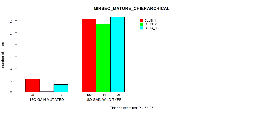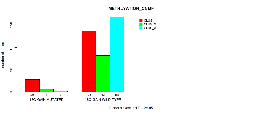 18q gain cnv correlated to 'CN_CNMF', 'METHLYATION_CNMF', 'MRNASEQ_CNMF', 'MRNASEQ_CHIERARCHICAL', 'MIRSEQ_CNMF', 'MIRSEQ_CHIERARCHICAL', 'MIRSEQ_MATURE_CNMF', and 'MIRSEQ_MATURE_CHIERARCHICAL'.
