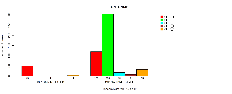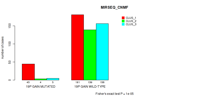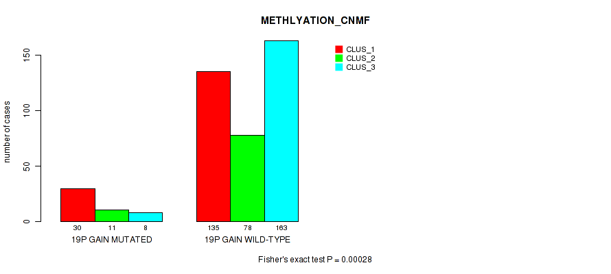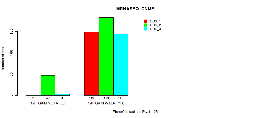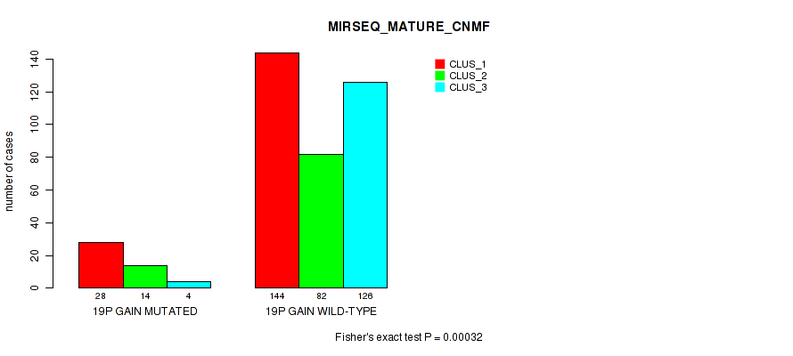 19p gain cnv correlated to 'CN_CNMF', 'METHLYATION_CNMF', 'MRNASEQ_CNMF', 'MRNASEQ_CHIERARCHICAL', 'MIRSEQ_CNMF', 'MIRSEQ_CHIERARCHICAL', and 'MIRSEQ_MATURE_CNMF'.