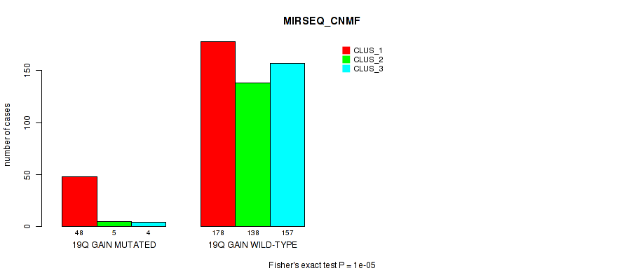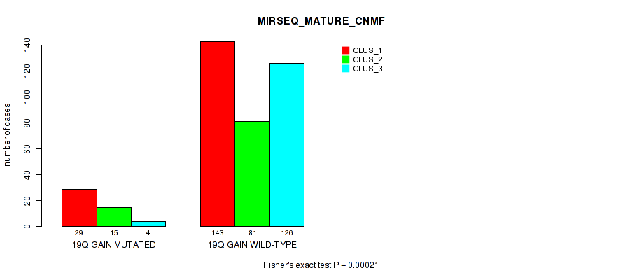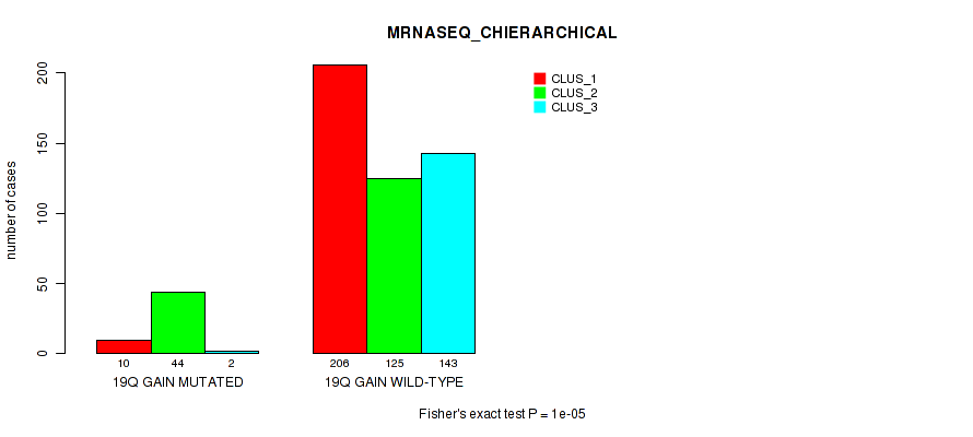 19q gain cnv correlated to 'CN_CNMF', 'METHLYATION_CNMF', 'MRNASEQ_CNMF', 'MRNASEQ_CHIERARCHICAL', 'MIRSEQ_CNMF', 'MIRSEQ_CHIERARCHICAL', and 'MIRSEQ_MATURE_CNMF'.