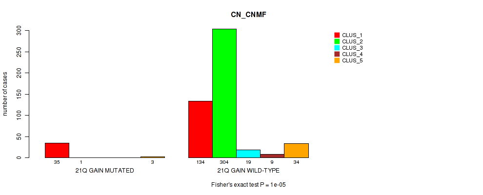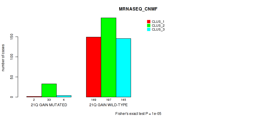 21q gain cnv correlated to 'CN_CNMF', 'METHLYATION_CNMF', 'MRNASEQ_CNMF', 'MRNASEQ_CHIERARCHICAL', 'MIRSEQ_CNMF', 'MIRSEQ_CHIERARCHICAL', and 'MIRSEQ_MATURE_CNMF'.