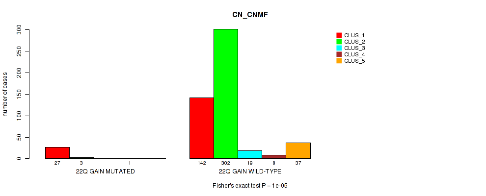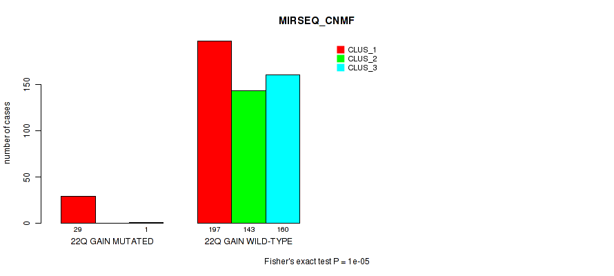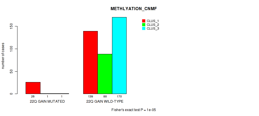 22q gain cnv correlated to 'CN_CNMF', 'METHLYATION_CNMF', 'MRNASEQ_CNMF', 'MRNASEQ_CHIERARCHICAL', 'MIRSEQ_CNMF', 'MIRSEQ_CHIERARCHICAL', 'MIRSEQ_MATURE_CNMF', and 'MIRSEQ_MATURE_CHIERARCHICAL'.