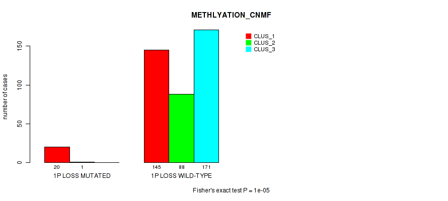 1p loss cnv correlated to 'CN_CNMF', 'METHLYATION_CNMF', 'MRNASEQ_CNMF', 'MRNASEQ_CHIERARCHICAL', 'MIRSEQ_CNMF', and 'MIRSEQ_CHIERARCHICAL'.
