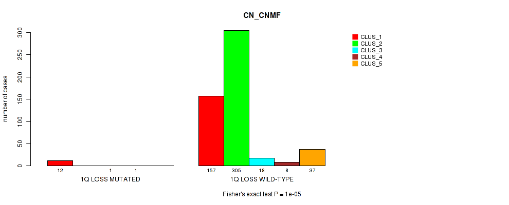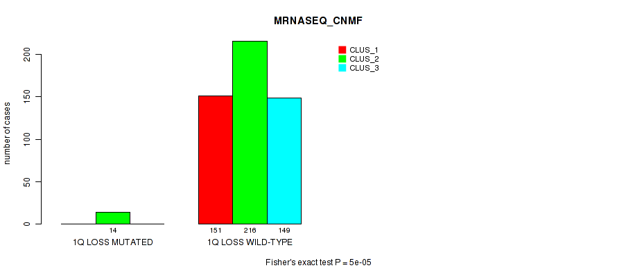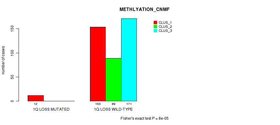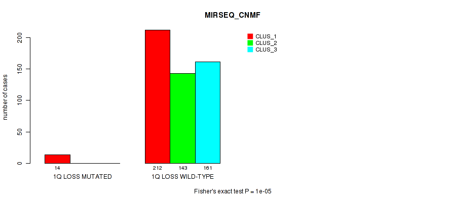 1q loss cnv correlated to 'CN_CNMF', 'METHLYATION_CNMF', 'MRNASEQ_CNMF', 'MRNASEQ_CHIERARCHICAL', 'MIRSEQ_CNMF', and 'MIRSEQ_CHIERARCHICAL'.