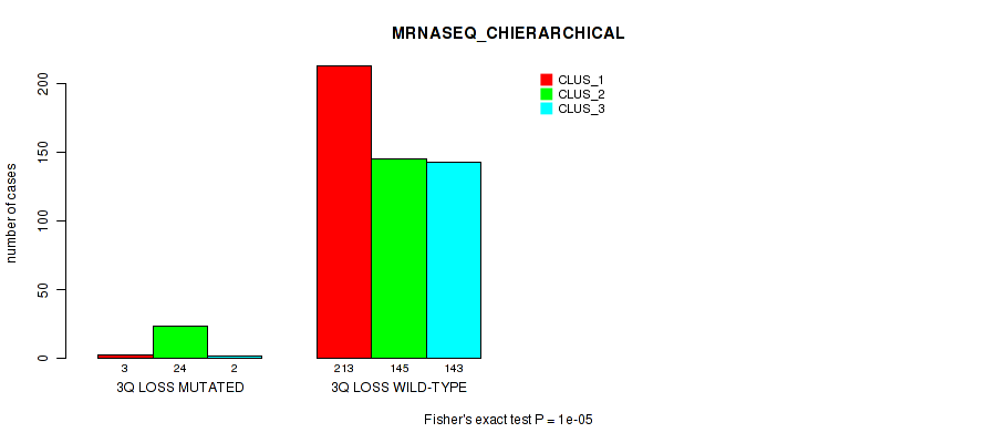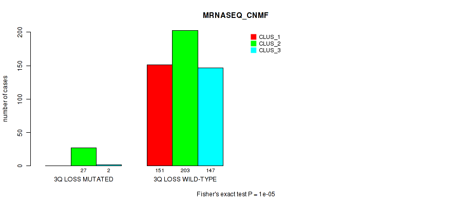 3q loss cnv correlated to 'CN_CNMF', 'METHLYATION_CNMF', 'MRNASEQ_CNMF', 'MRNASEQ_CHIERARCHICAL', and 'MIRSEQ_CNMF'.