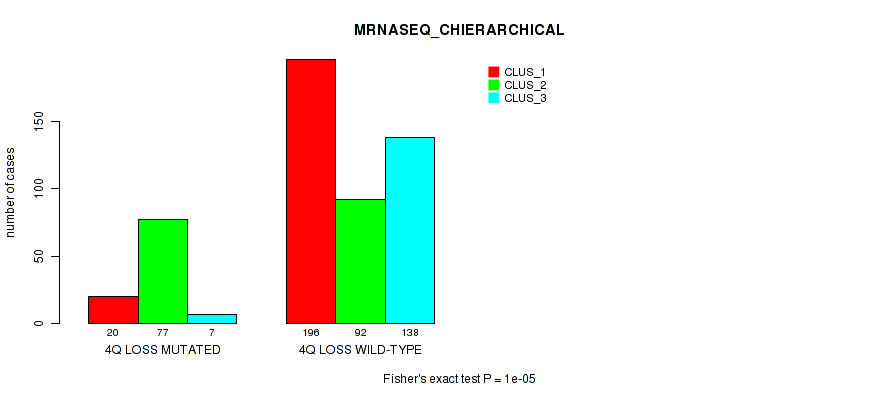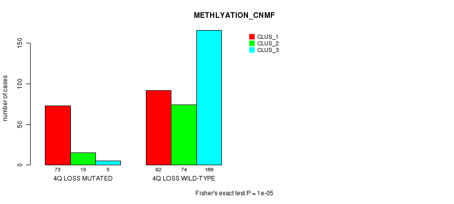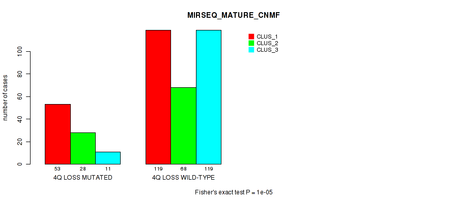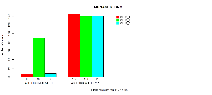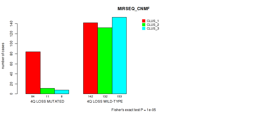 4q loss cnv correlated to 'CN_CNMF', 'METHLYATION_CNMF', 'MRNASEQ_CNMF', 'MRNASEQ_CHIERARCHICAL', 'MIRSEQ_CNMF', 'MIRSEQ_CHIERARCHICAL', 'MIRSEQ_MATURE_CNMF', and 'MIRSEQ_MATURE_CHIERARCHICAL'.