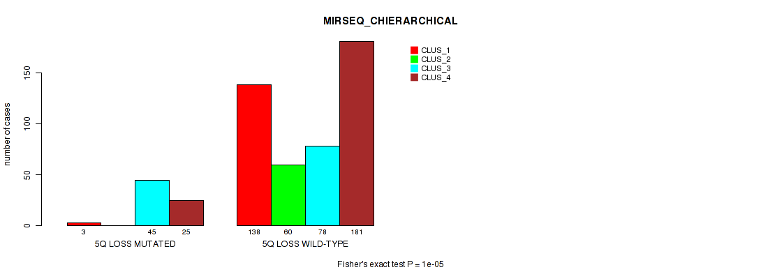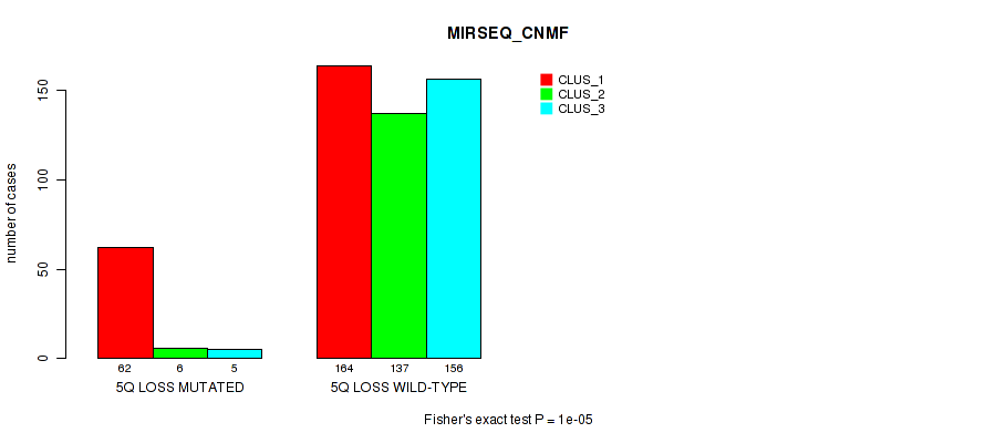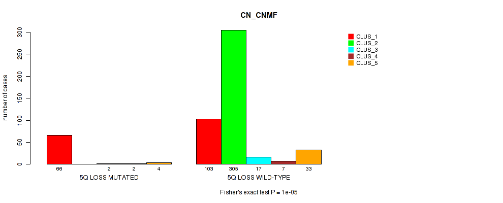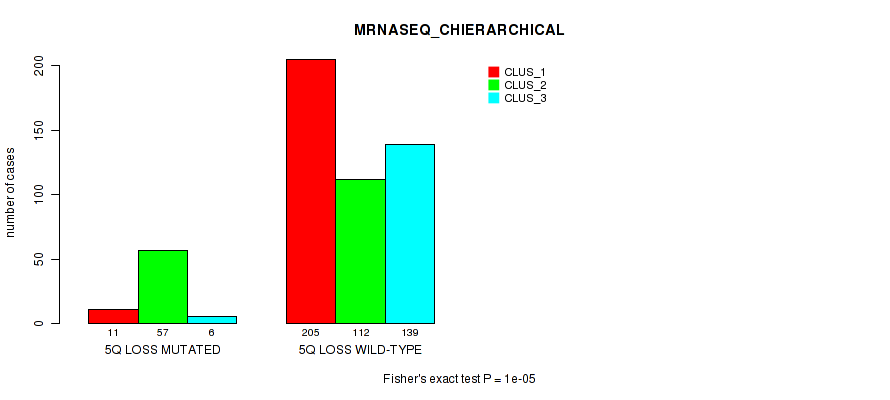 5q loss cnv correlated to 'CN_CNMF', 'METHLYATION_CNMF', 'MRNASEQ_CNMF', 'MRNASEQ_CHIERARCHICAL', 'MIRSEQ_CNMF', 'MIRSEQ_CHIERARCHICAL', 'MIRSEQ_MATURE_CNMF', and 'MIRSEQ_MATURE_CHIERARCHICAL'.