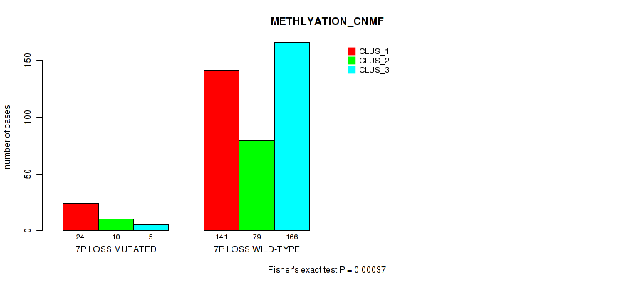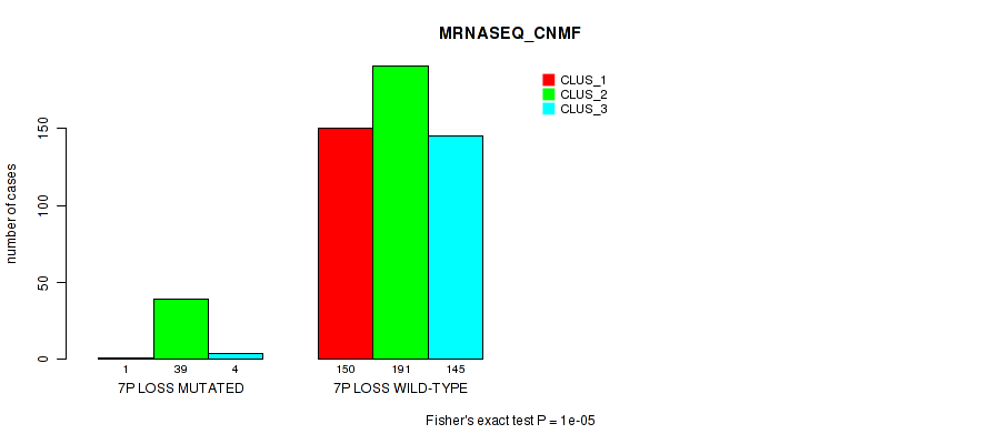 7p loss cnv correlated to 'CN_CNMF', 'METHLYATION_CNMF', 'MRNASEQ_CNMF', 'MRNASEQ_CHIERARCHICAL', 'MIRSEQ_CNMF', and 'MIRSEQ_CHIERARCHICAL'.