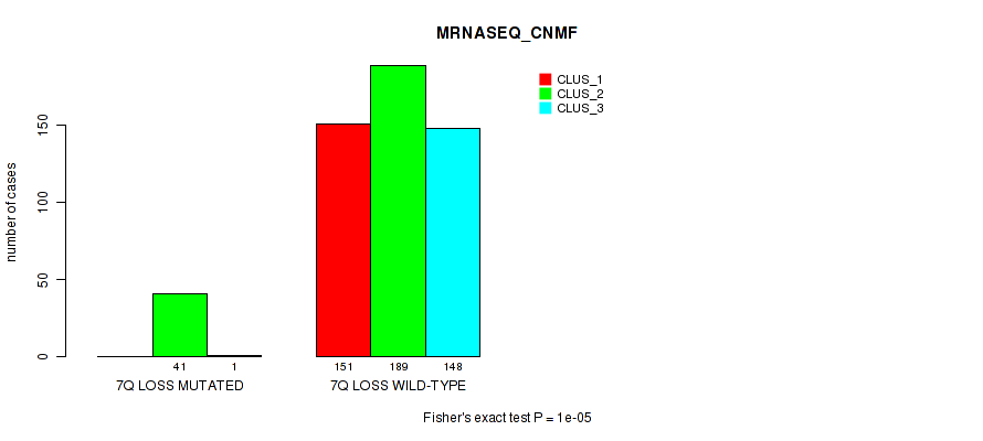 7q loss cnv correlated to 'CN_CNMF', 'METHLYATION_CNMF', 'MRNASEQ_CNMF', 'MRNASEQ_CHIERARCHICAL', 'MIRSEQ_CNMF', 'MIRSEQ_CHIERARCHICAL', and 'MIRSEQ_MATURE_CHIERARCHICAL'.