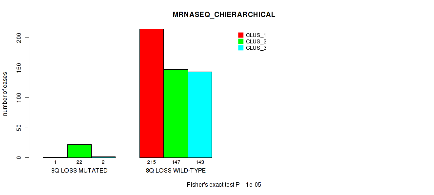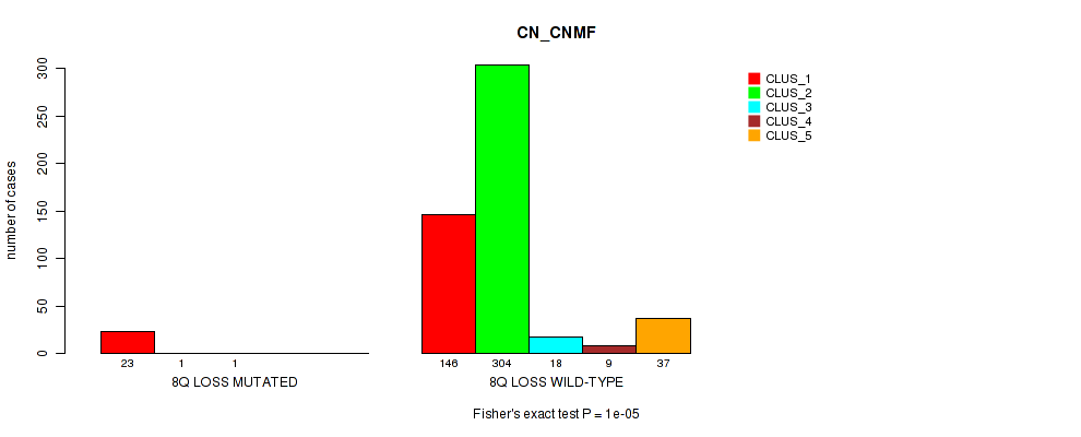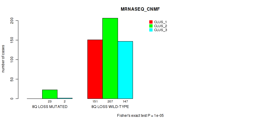 8q loss cnv correlated to 'CN_CNMF', 'METHLYATION_CNMF', 'MRNASEQ_CNMF', 'MRNASEQ_CHIERARCHICAL', 'MIRSEQ_CNMF', and 'MIRSEQ_CHIERARCHICAL'.