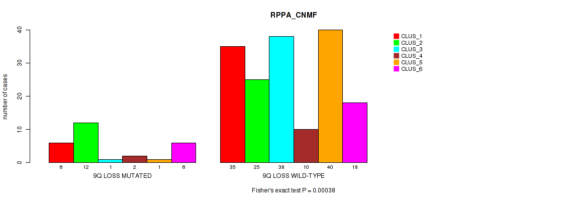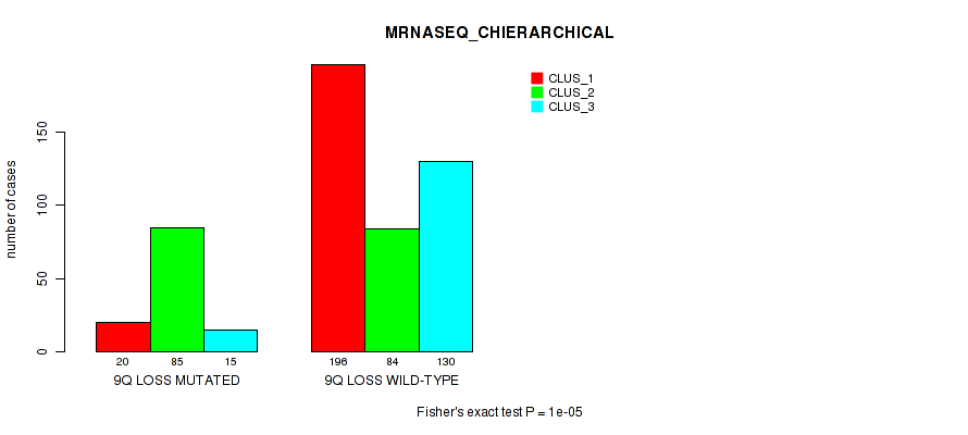 9q loss cnv correlated to 'MRNA_CNMF', 'MRNA_CHIERARCHICAL', 'CN_CNMF', 'METHLYATION_CNMF', 'RPPA_CNMF', 'MRNASEQ_CNMF', 'MRNASEQ_CHIERARCHICAL', 'MIRSEQ_CNMF', 'MIRSEQ_CHIERARCHICAL', and 'MIRSEQ_MATURE_CHIERARCHICAL'.