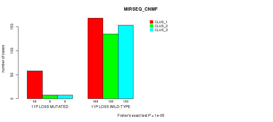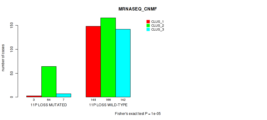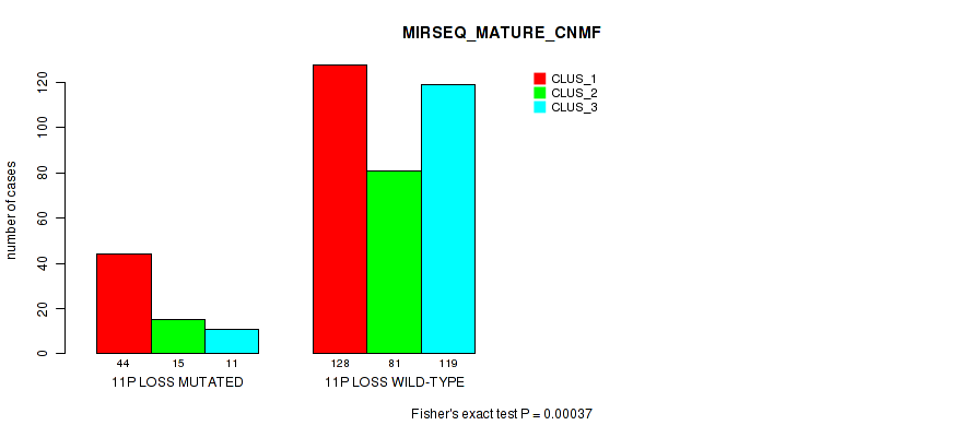 11p loss cnv correlated to 'CN_CNMF', 'METHLYATION_CNMF', 'MRNASEQ_CNMF', 'MRNASEQ_CHIERARCHICAL', 'MIRSEQ_CNMF', 'MIRSEQ_CHIERARCHICAL', 'MIRSEQ_MATURE_CNMF', and 'MIRSEQ_MATURE_CHIERARCHICAL'.