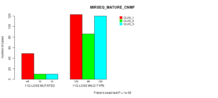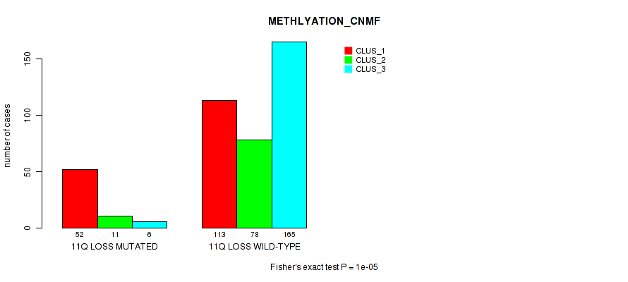 11q loss cnv correlated to 'CN_CNMF', 'METHLYATION_CNMF', 'MRNASEQ_CNMF', 'MRNASEQ_CHIERARCHICAL', 'MIRSEQ_CNMF', 'MIRSEQ_CHIERARCHICAL', 'MIRSEQ_MATURE_CNMF', and 'MIRSEQ_MATURE_CHIERARCHICAL'.